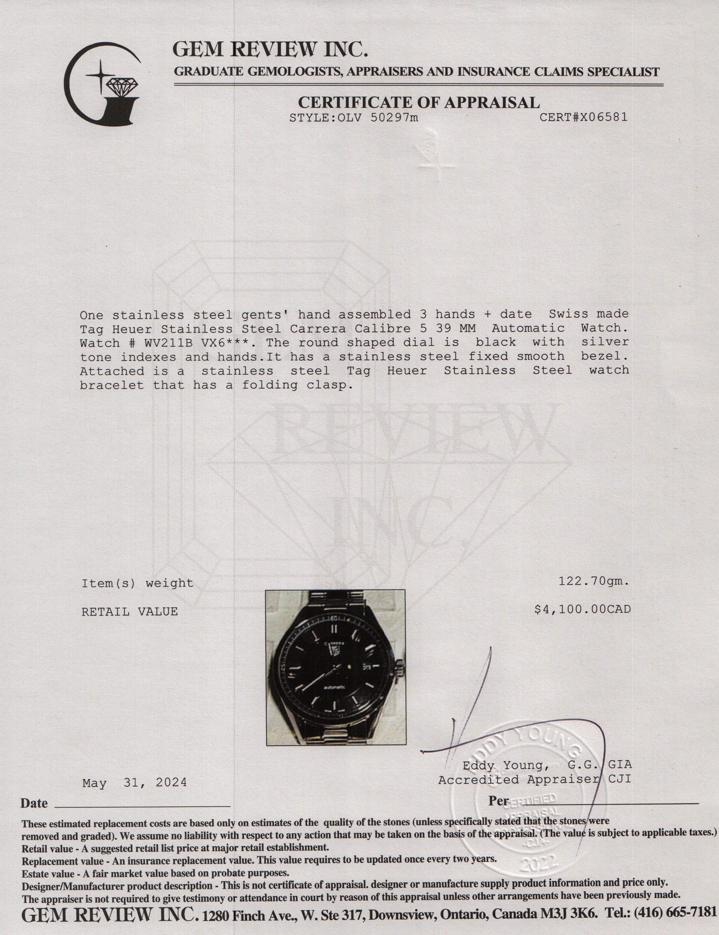 Stainless Steel Carrera Calibre 5 39 MM Automatic Watch WV211B w/ Case