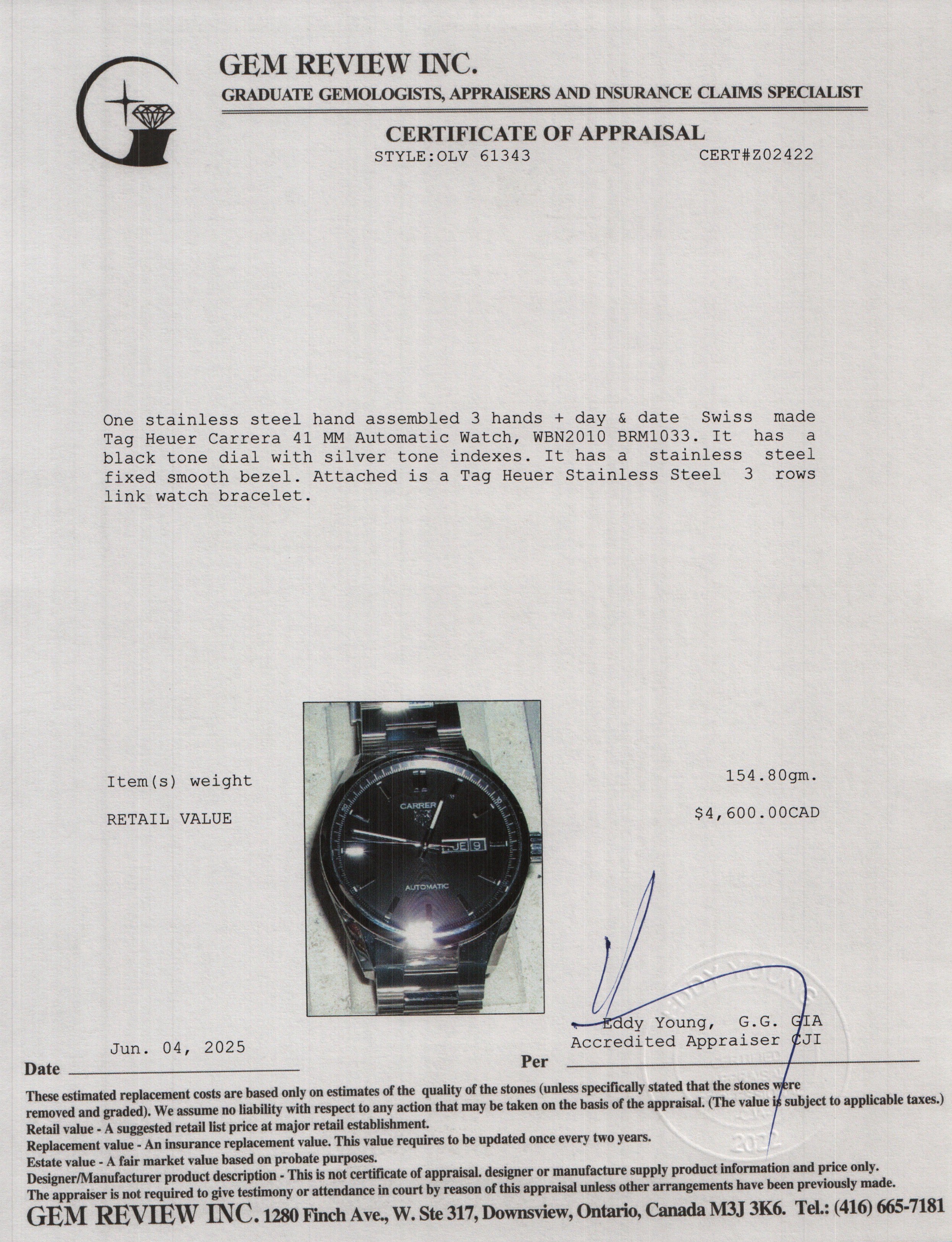 Stainless Steel Carrera Day-Date 41 MM Automatic Watch Black Dial WBN2010 w/ Box & Papers