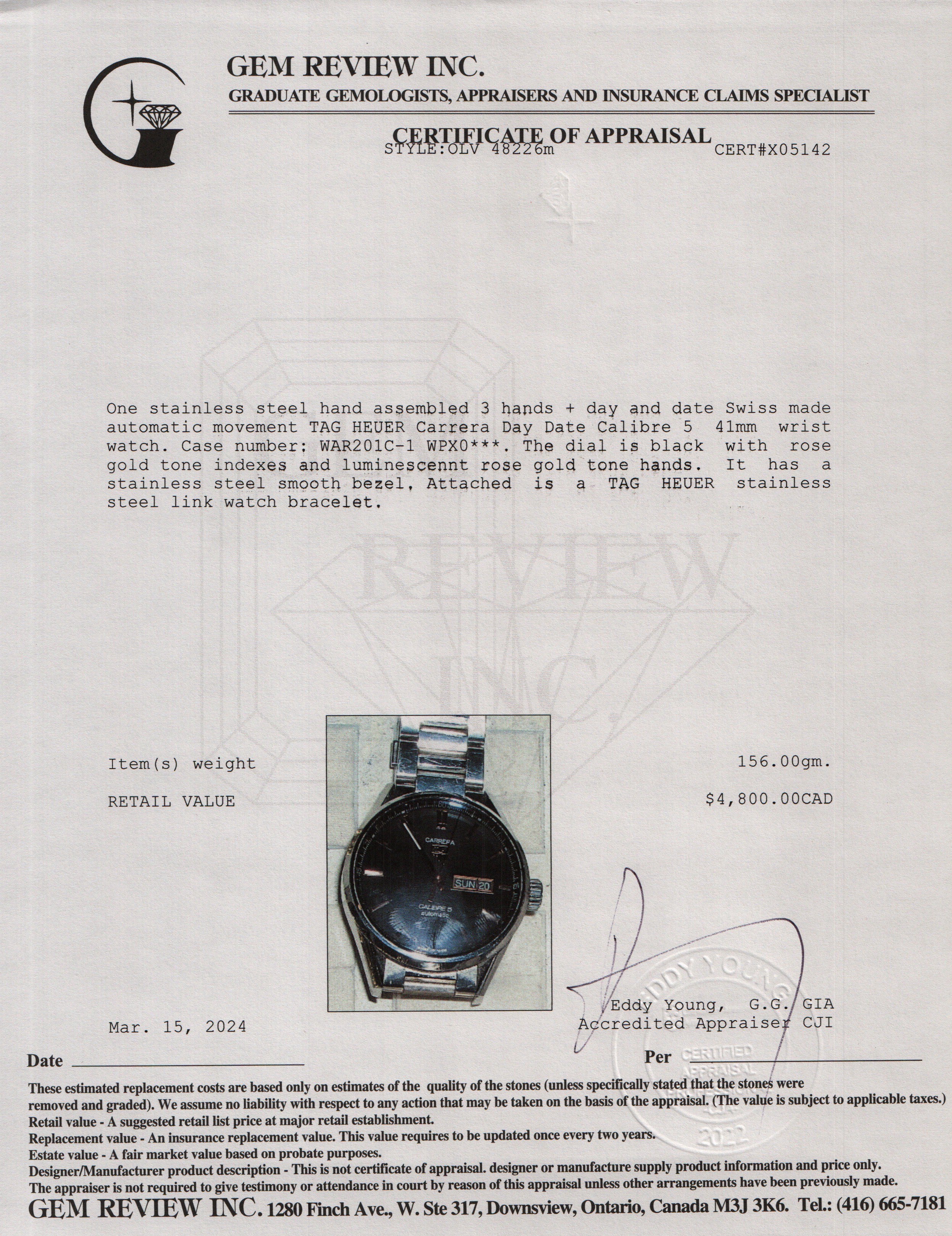 Stainless Steel Carrera Day Date Calibre 5 41 MM Automatic Watch