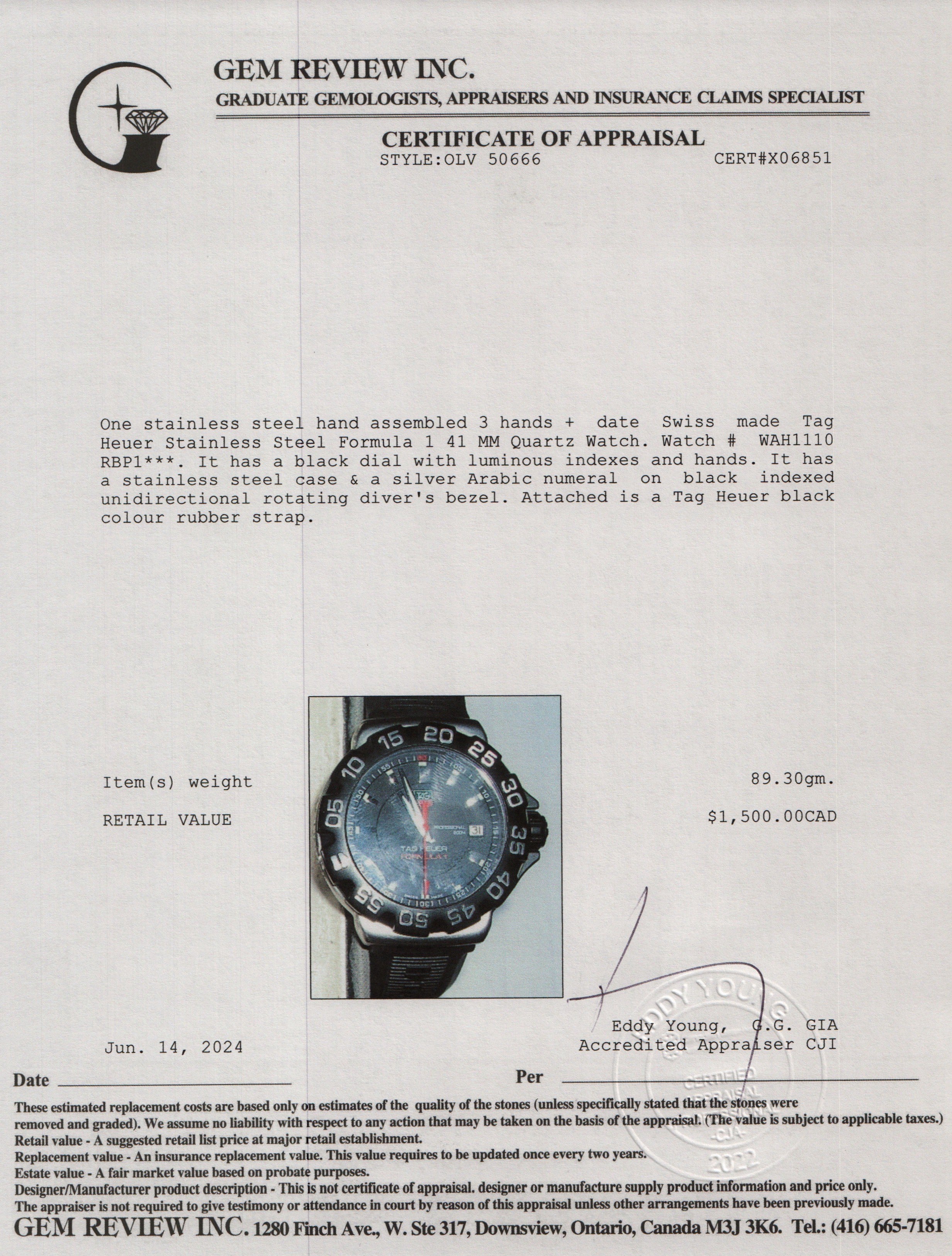 Stainless Steel Formula 1 41 MM Quartz Watch WAH1110 w/ Case & Card