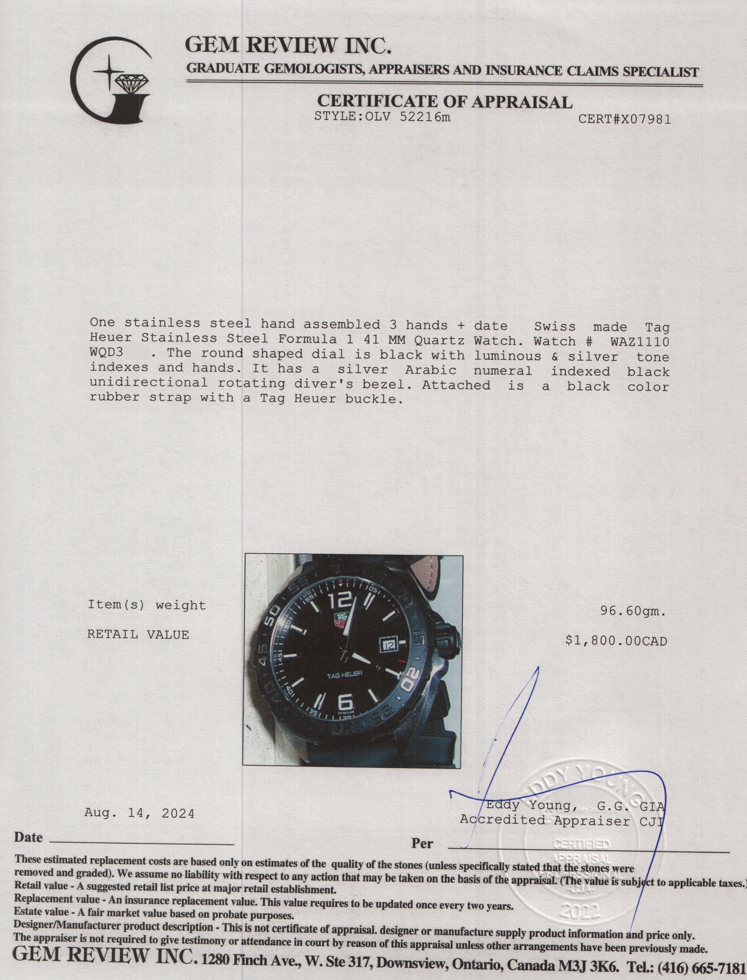 Stainless Steel Formula 1 41 MM Quartz Watch WAZ1110 w/ Box & Papers