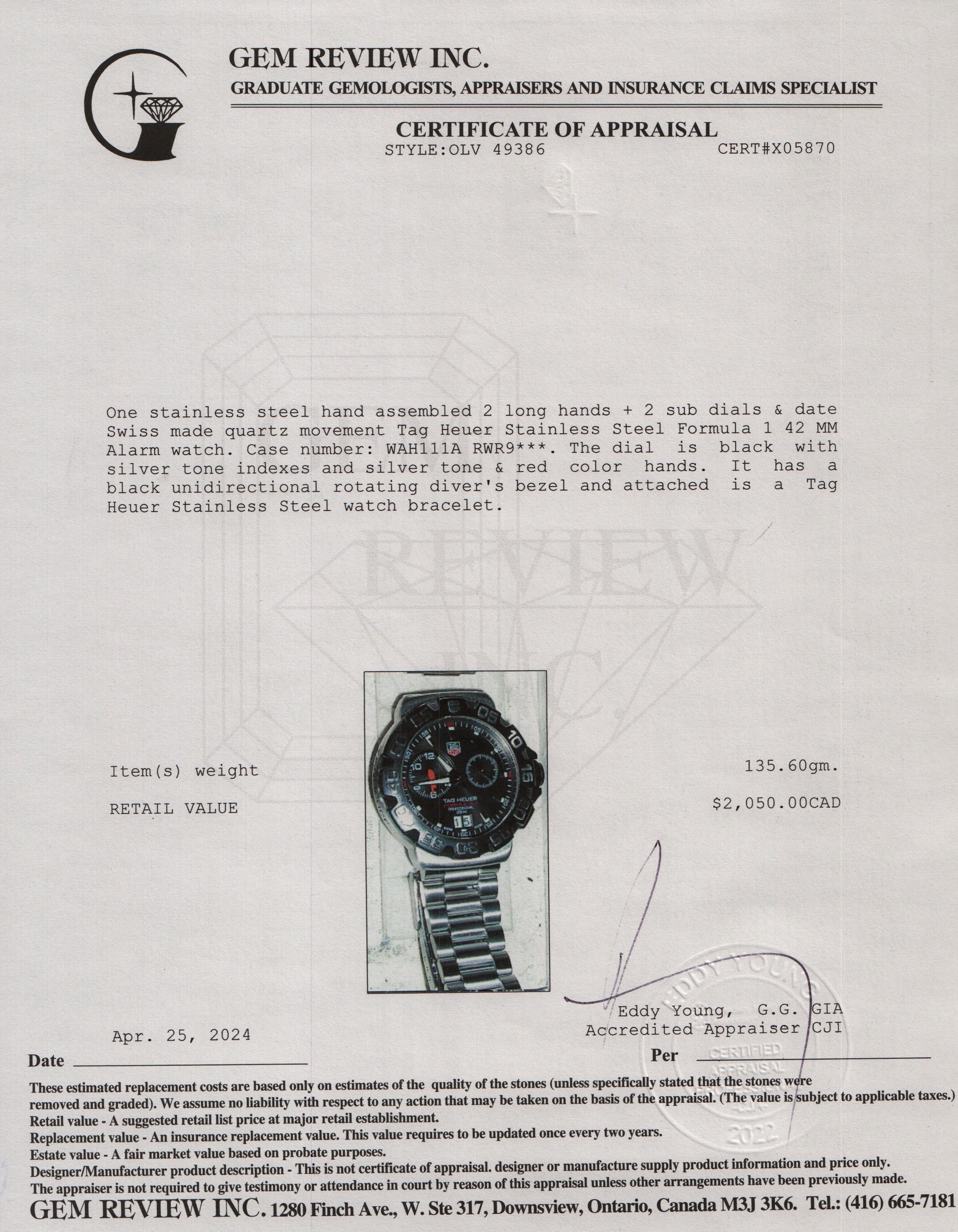 Stainless Steel Formula 1 42 MM Chronograph Alarm Watch WAH111A w/ Box & Papers