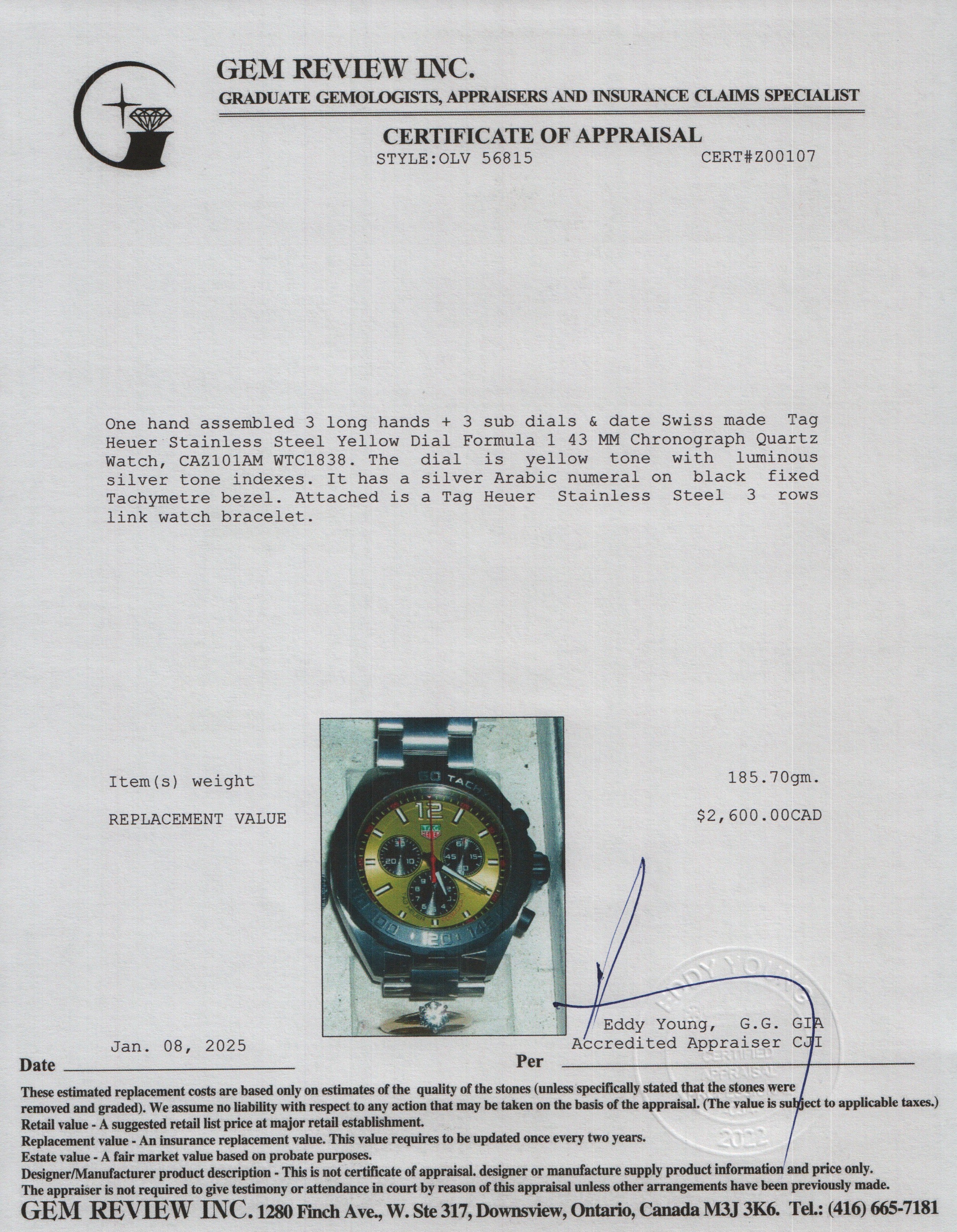 Stainless Steel Yellow Dial Formula 1 43 MM Chronograph Quartz Watch CAZ101AM w/ Box & Papers