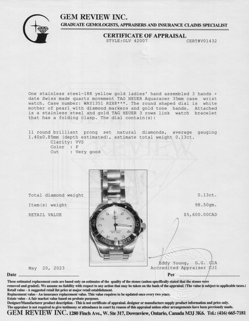 Included Items: Original Tag Heuer Box, Warranty Card, Booklet and Gem Review Appraisal