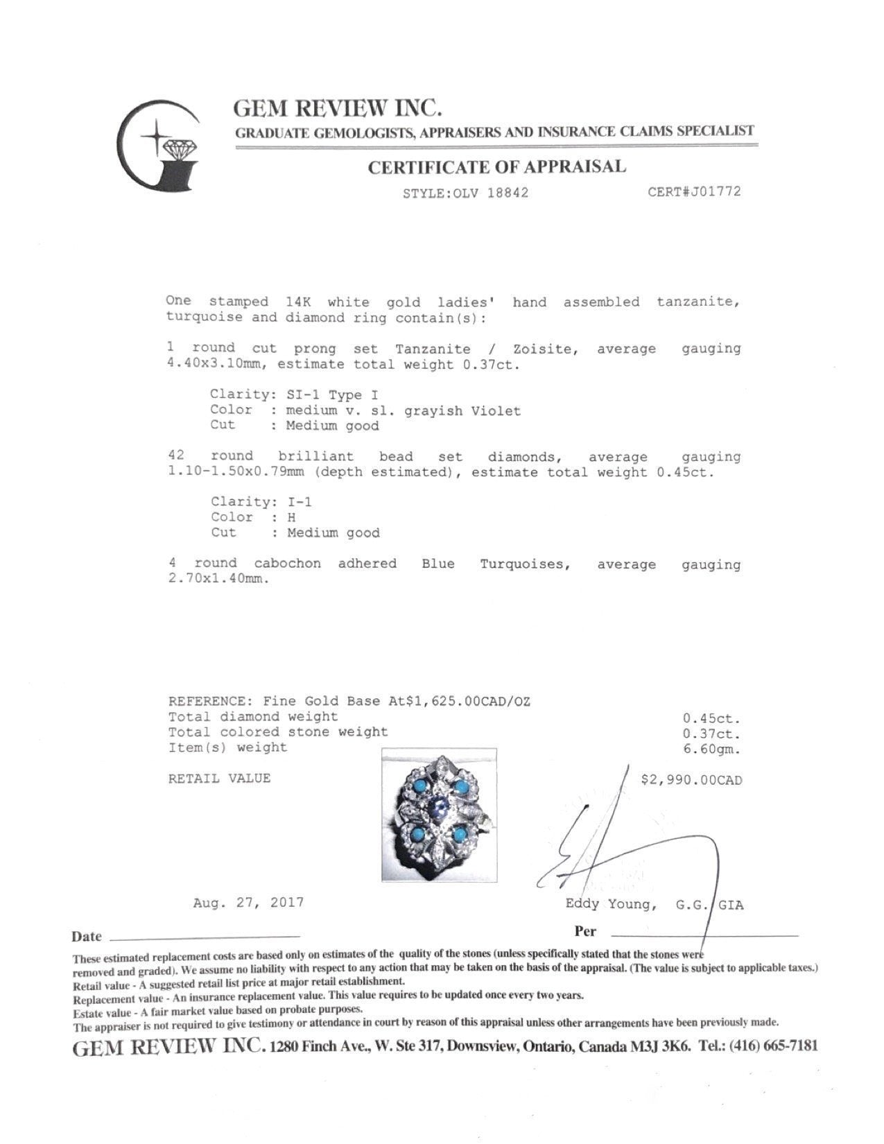 Tanzanite, Turquoise and Diamond Ring in 14kt White Gold; Tanzanite, Approximately 0.37 ct.; Approximately 0.45 Total Diamond Carat Weight, I1 Clarity, H Colour; Size 6 3/4; Comes with $2,990 Gem Review Appraisal