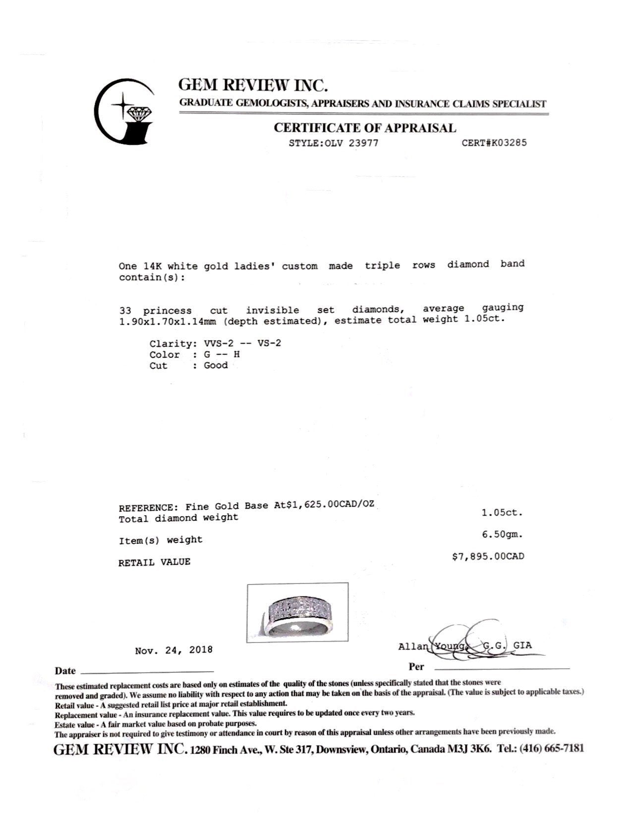 - 33 Princess Cut Invisible-Set Diamonds Totalling Approximately 1.05 ct. of VVS2-VS2 Clarity, G-H Colour, Good Cut