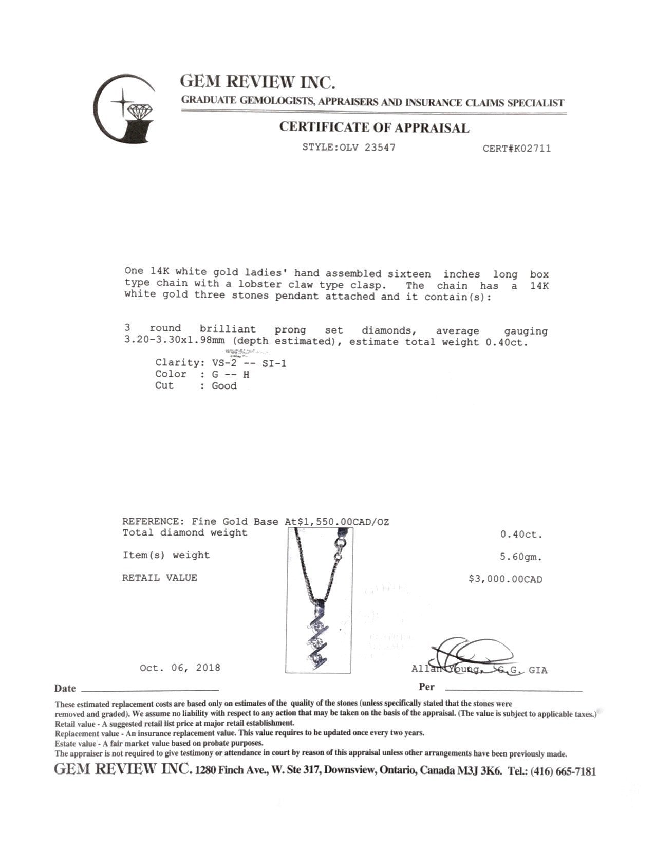 - 3 Round Brilliant Cut Diamonds Totalling Approximately 0.40 ct. of VS2-SI1 Clarity, G-H Colour, Good Cut