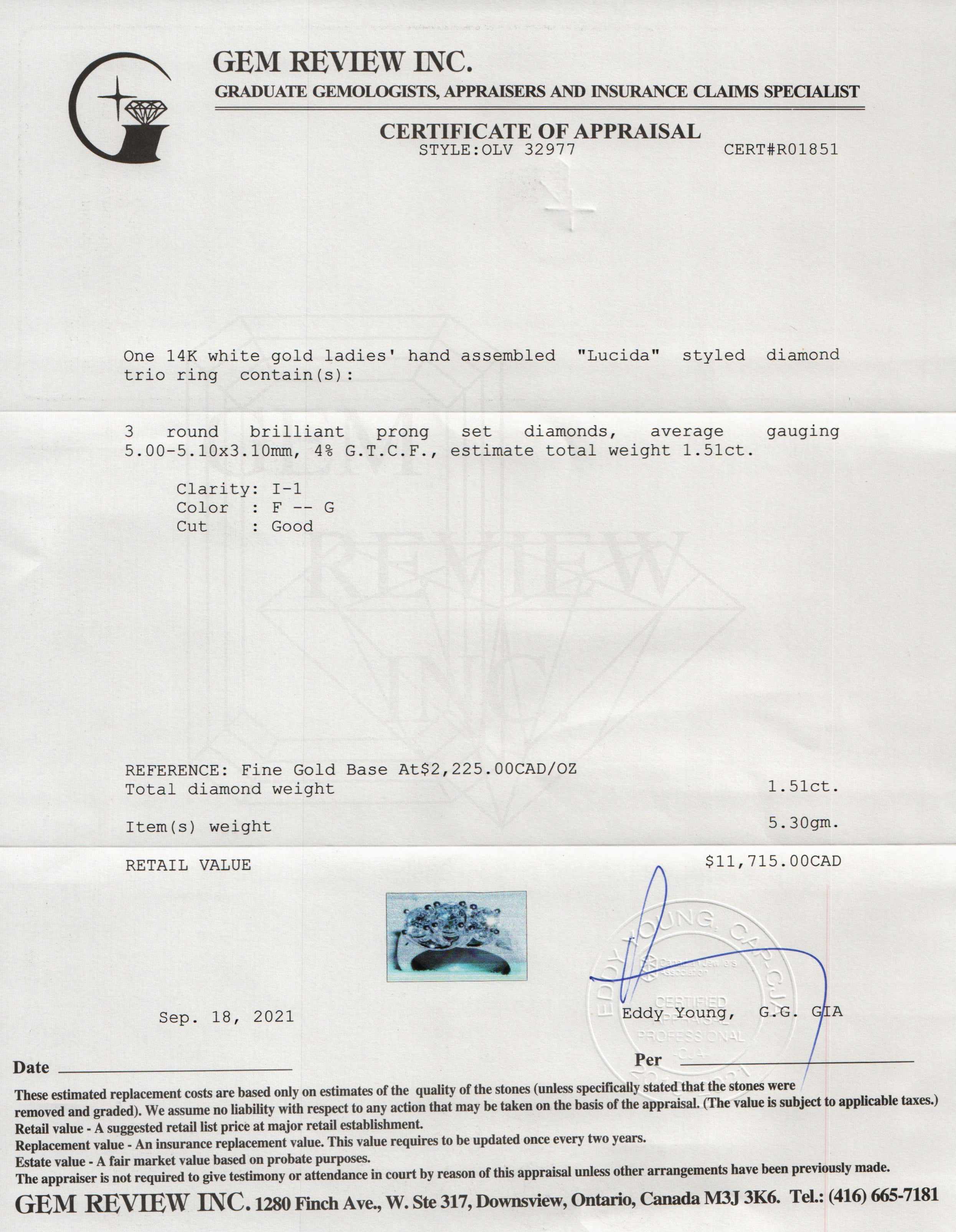 - 3 Round Brilliant Cut Diamonds Totalling Approximately 1.51 ct. of I1 Clarity, F-G Colour, Good Cut