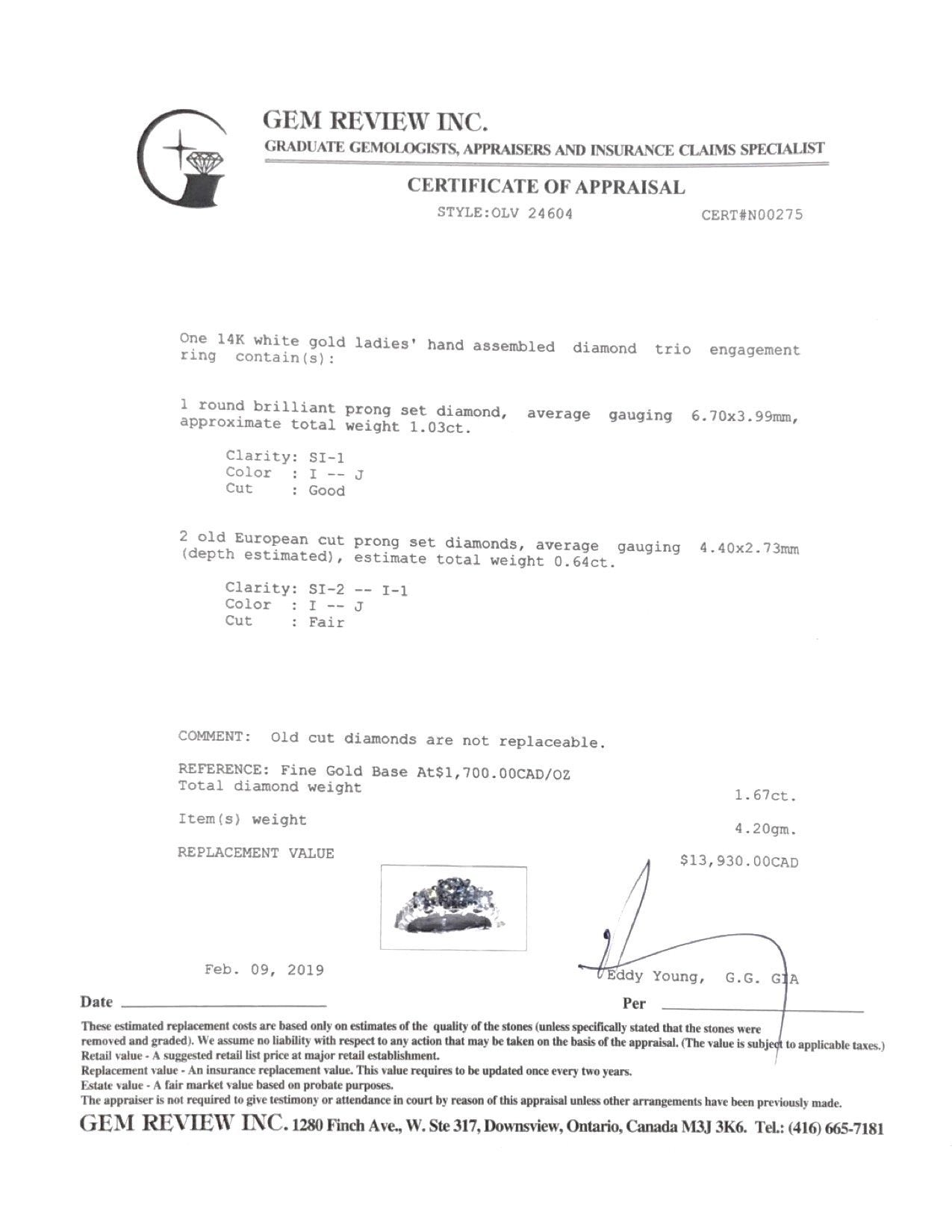 - 1 Round Brilliant Cut Diamond Weighing Approximately 1.03 ct. of SI1 Clarity, I-J Colour, Good Cut