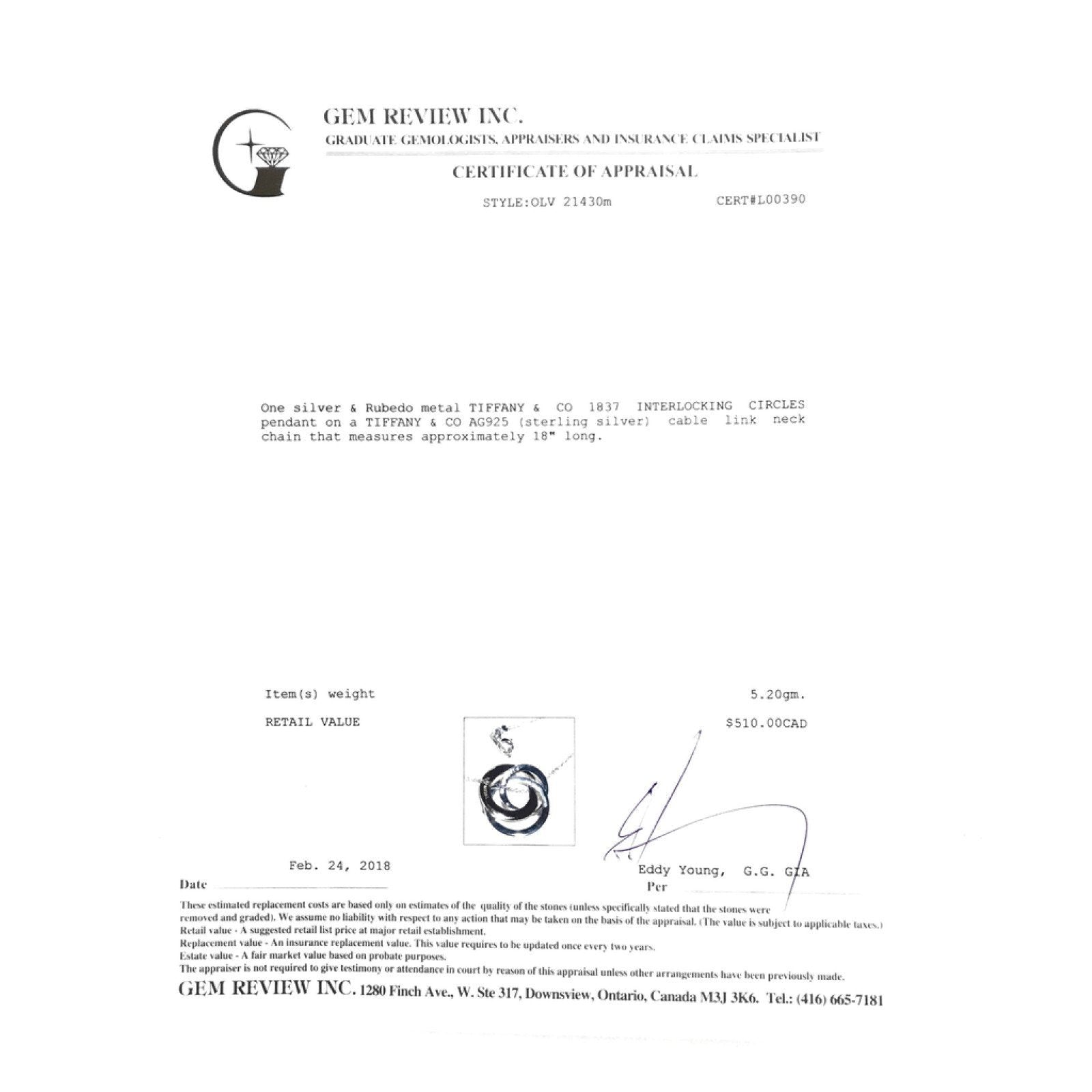 Tiffany & Co 1837 Interlocking Circles Pendant in Sterling Silver and Rubedo Metal on a Tiffany & Co Silver Cable Link Neck Chain Measuring Approximately 18” Long; Comes with Gem Review Appraisal
