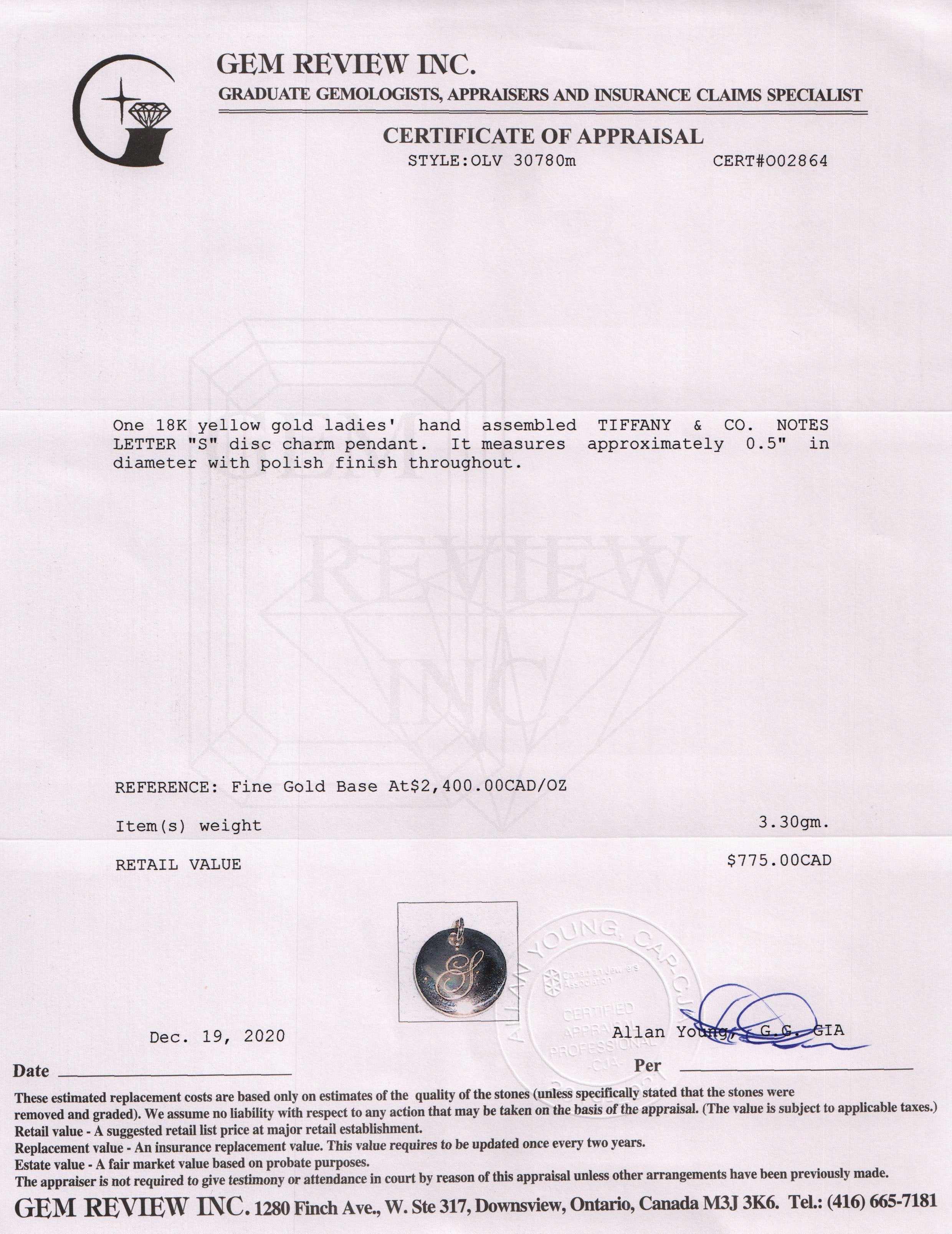 Tiffany & Co. 18k Gold Notes Letter 'S' Disc Charm Pendant