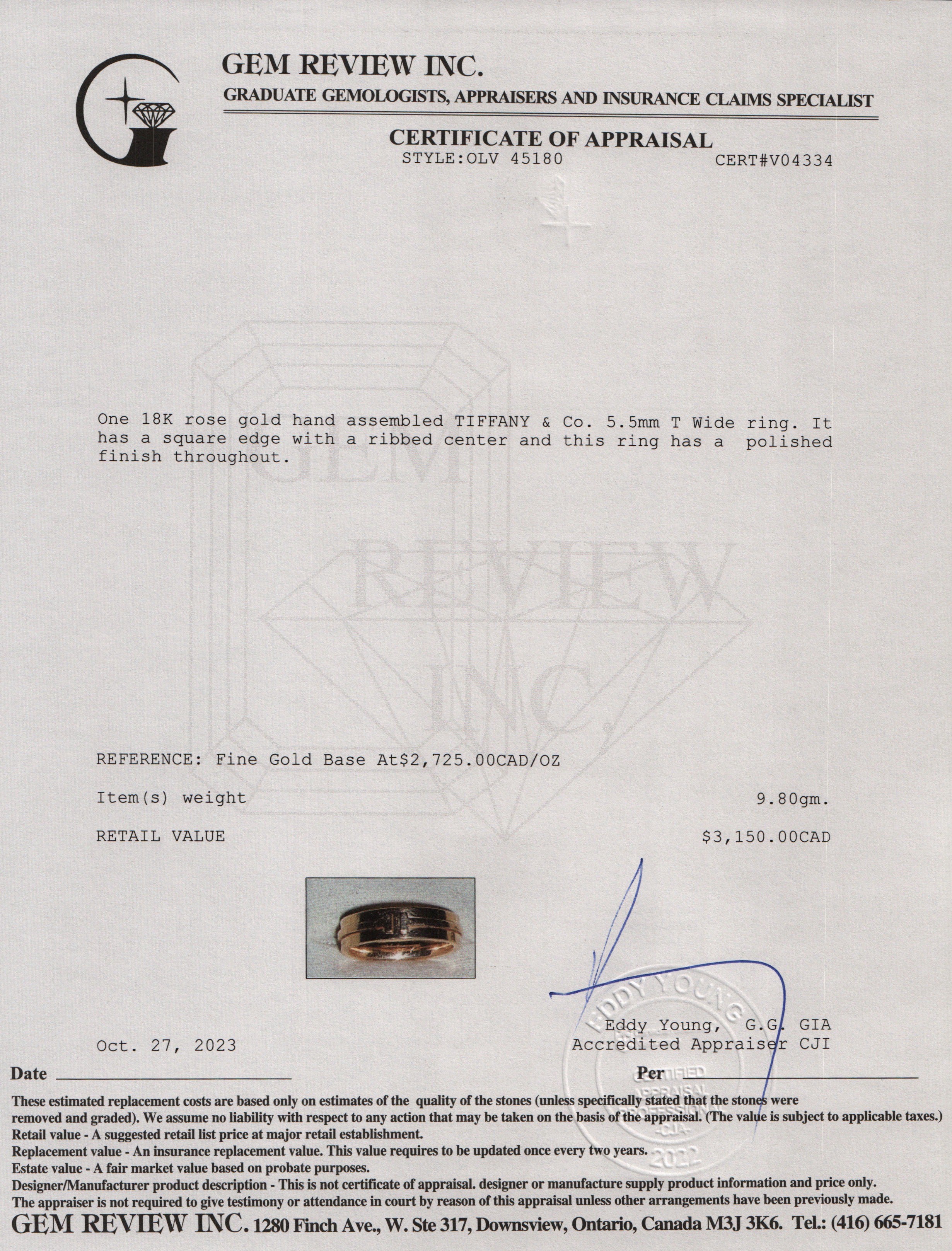 18k Rose Gold 5.5 MM T Wide Ring, Size 7.75 w/ Box