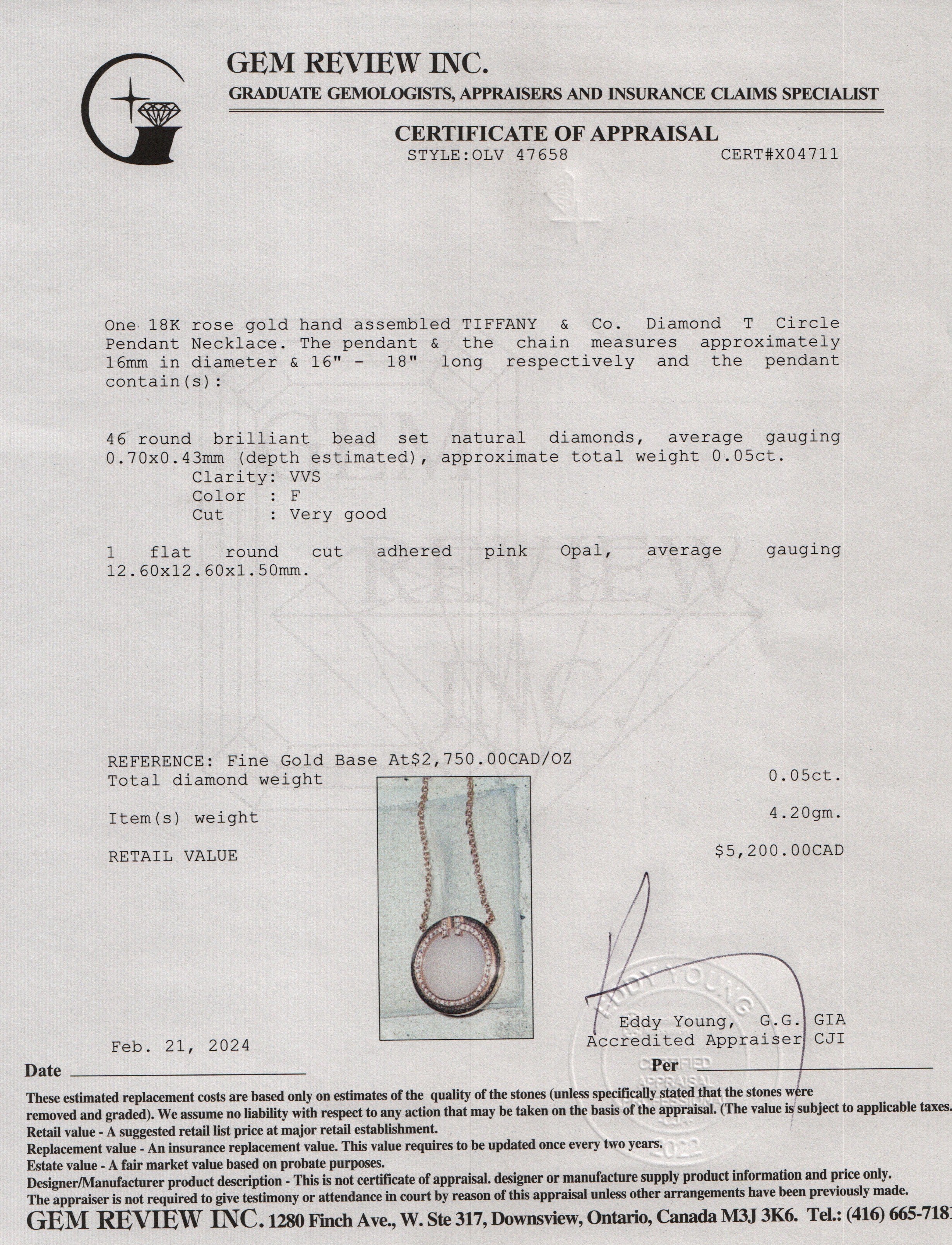 18k Rose Gold Diamond & Pink Opal 16 MM T Circle Pendant Necklace w/ Box