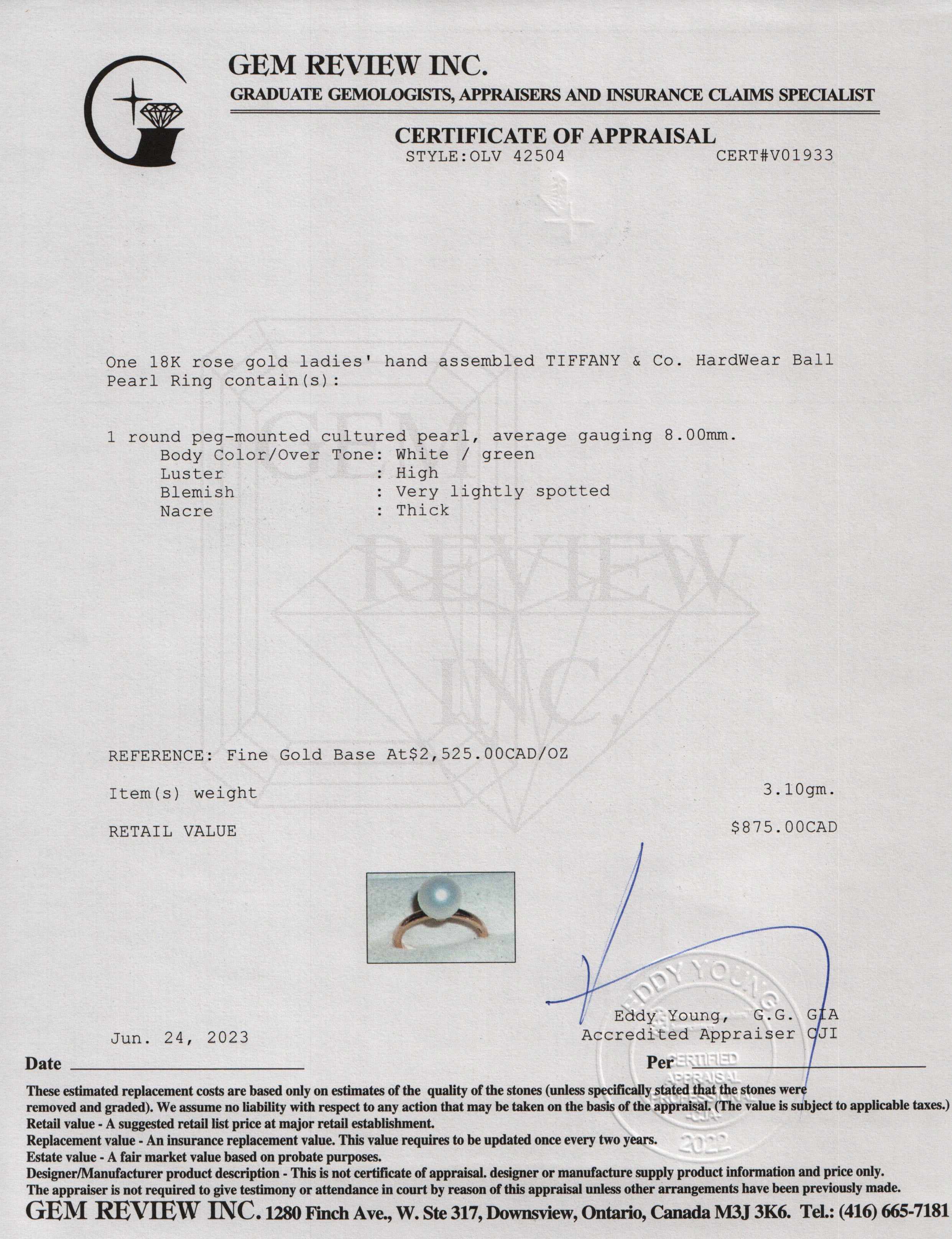 Tiffany & Co. 18k Rose Gold HardWear Ball Pearl Ring, 8MM