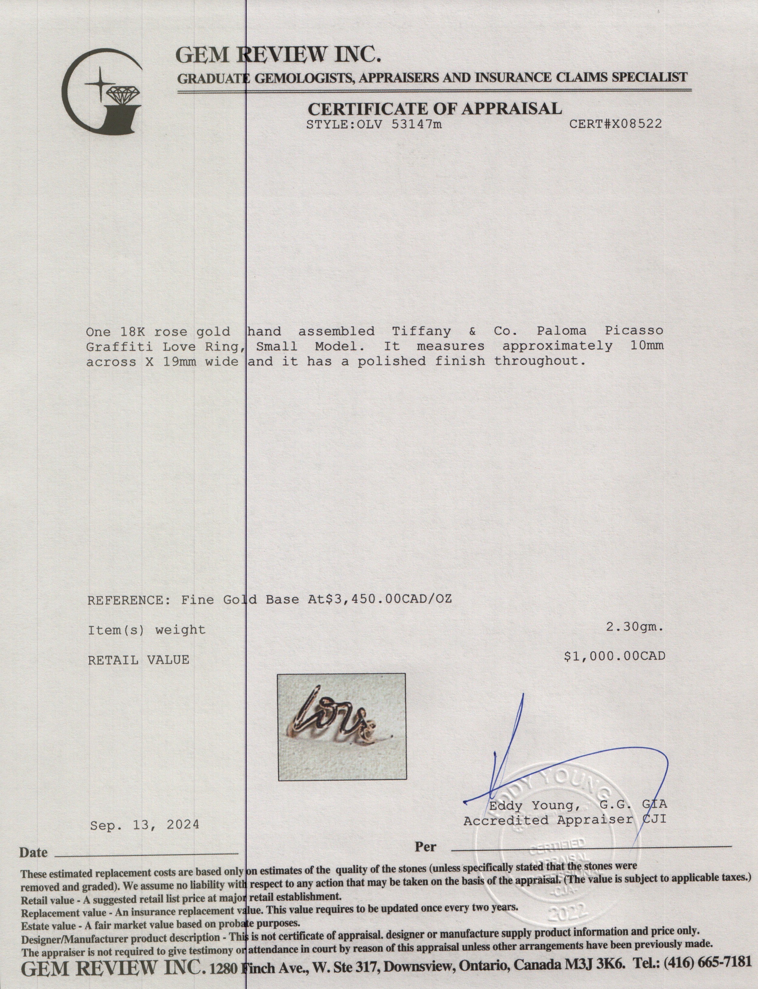 18K Rose Gold Paloma Picasso Graffiti Love Ring, Small Model, Size 6.25