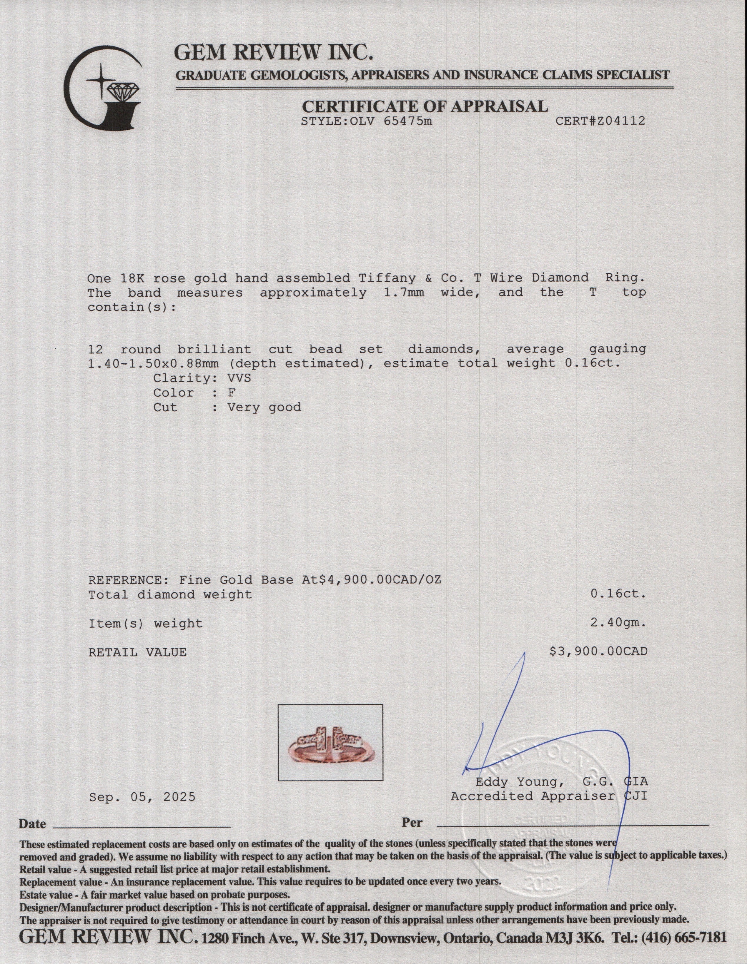 18k Rose Gold T Wire Diamond Ring, Size 5.5 w/ Box & Receipt