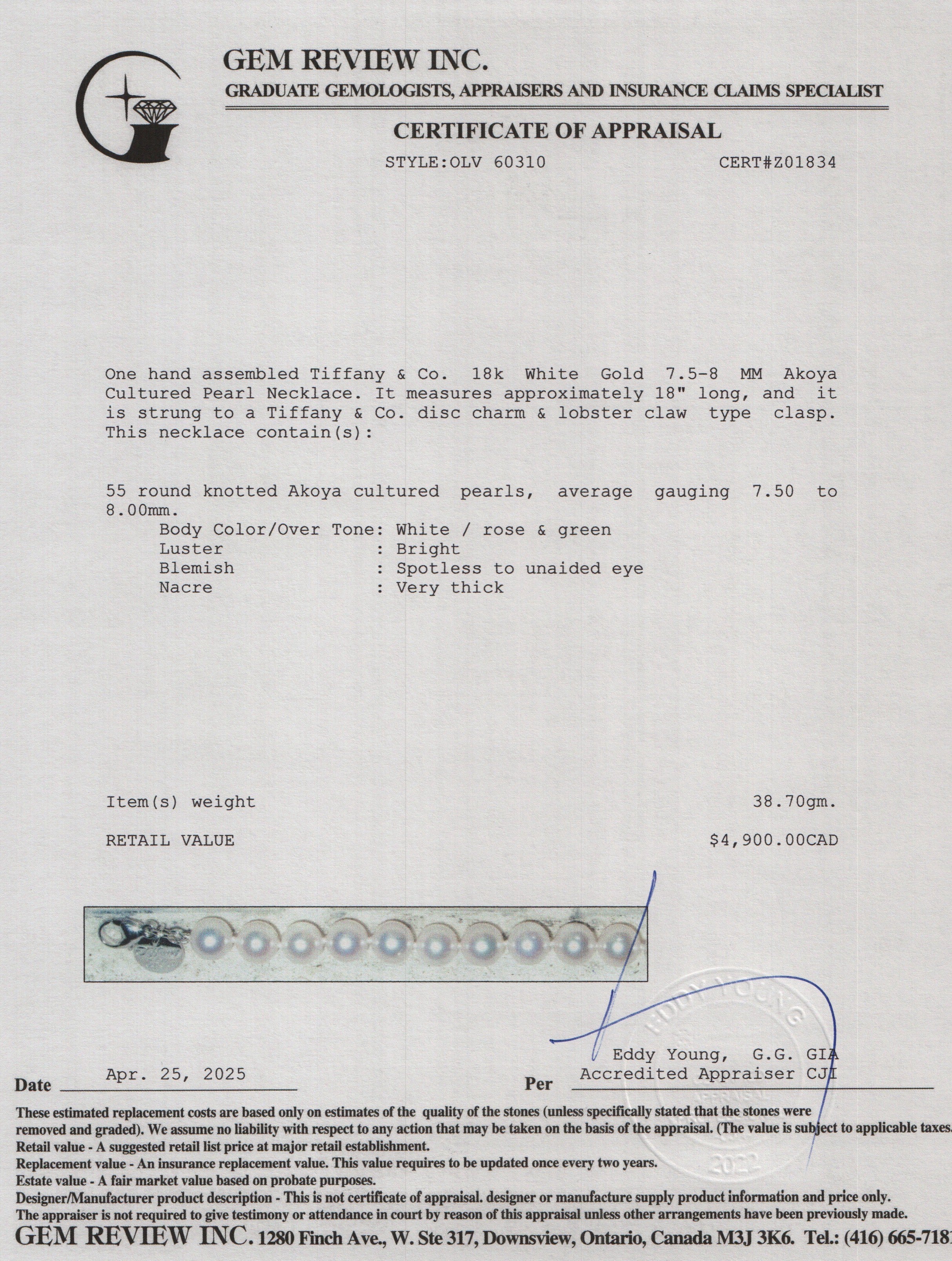 18k White Gold 7.5-8 MM Akoya Cultured Pearl Necklace w/ Box