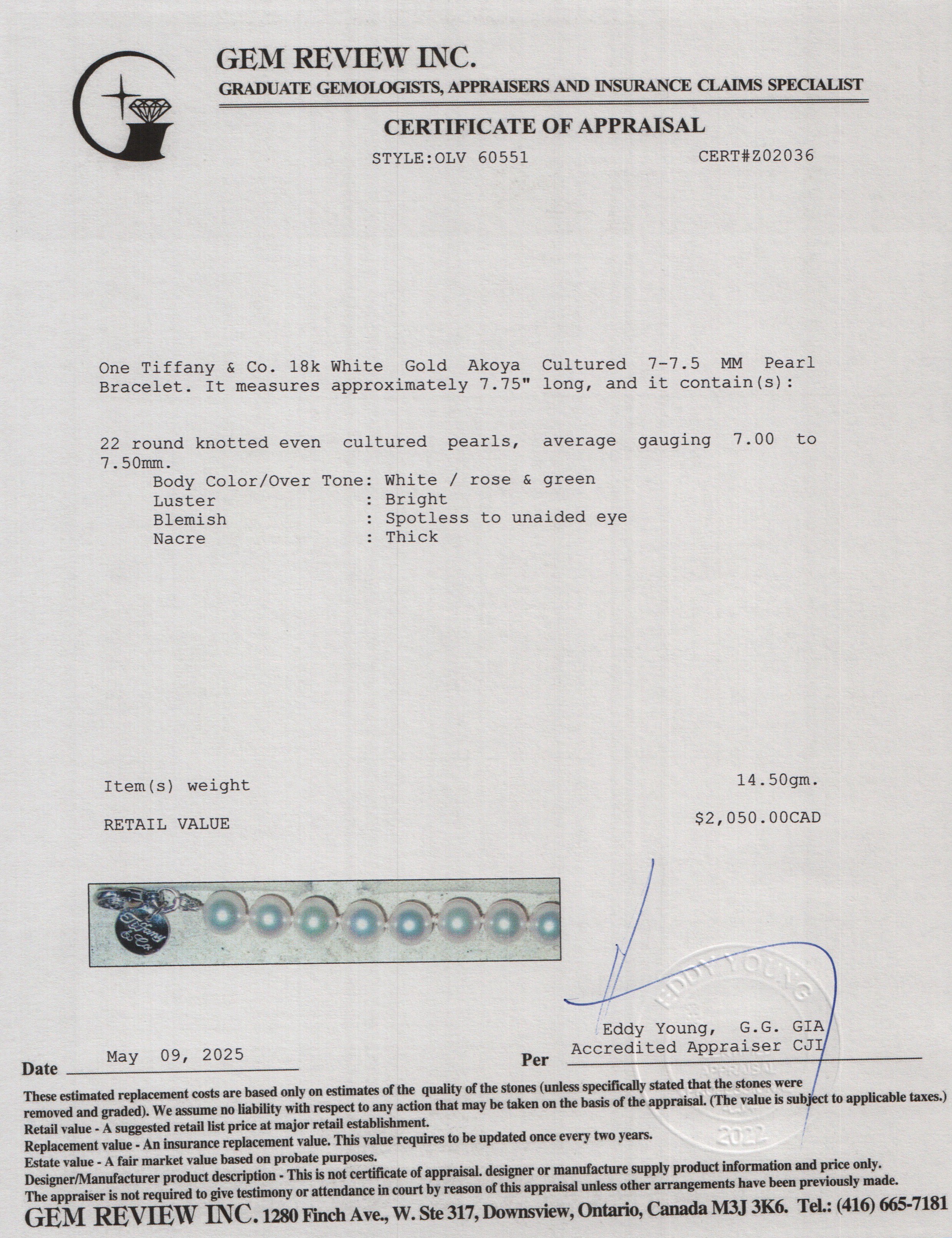 Length 7.75", Pearls 7-7.5 mm