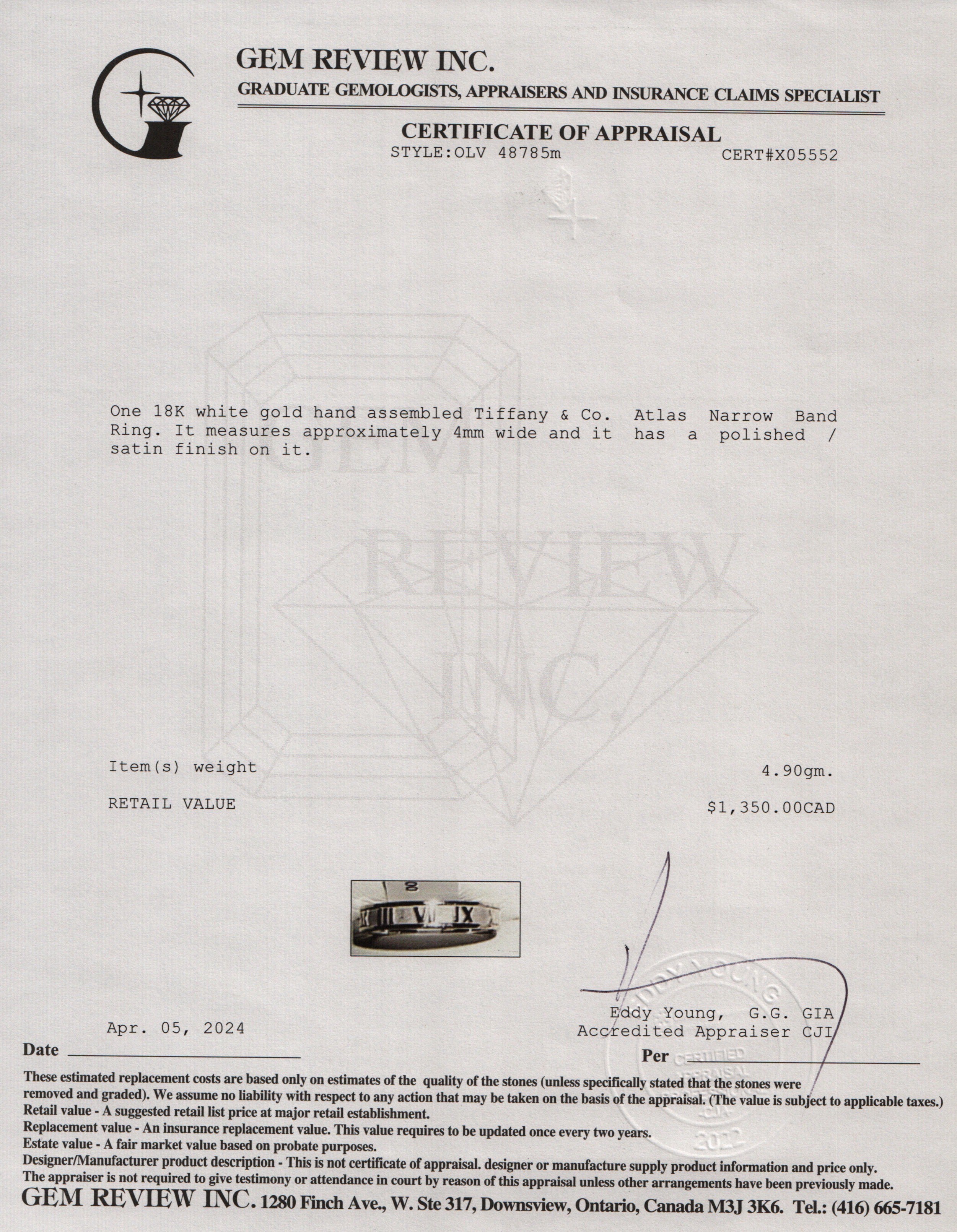 18k White Gold Atlas Narrow Band Ring, Size 9.5 w/ Box