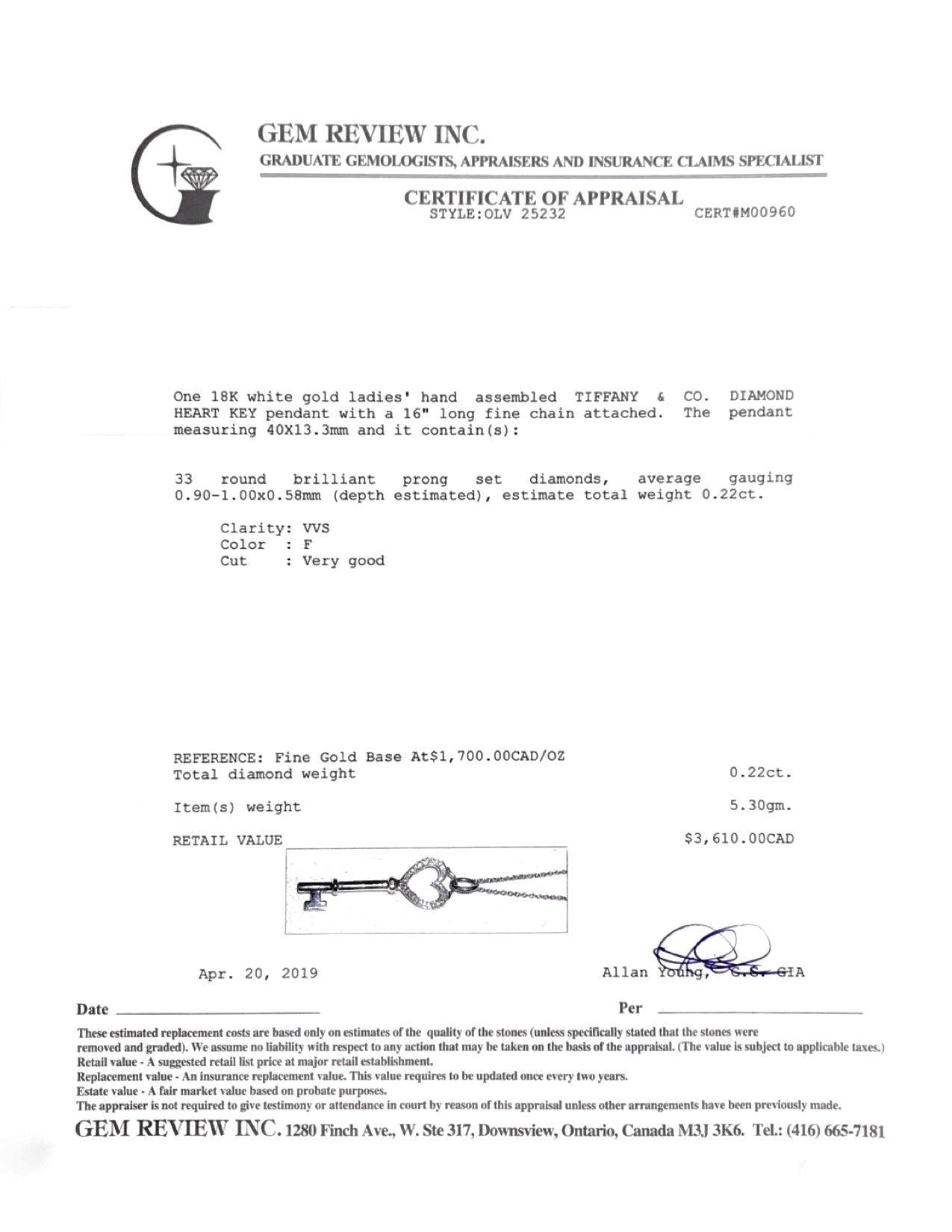 Tiffany & Co. 18k White Gold & Diamond Heart Key Pendant Necklace
