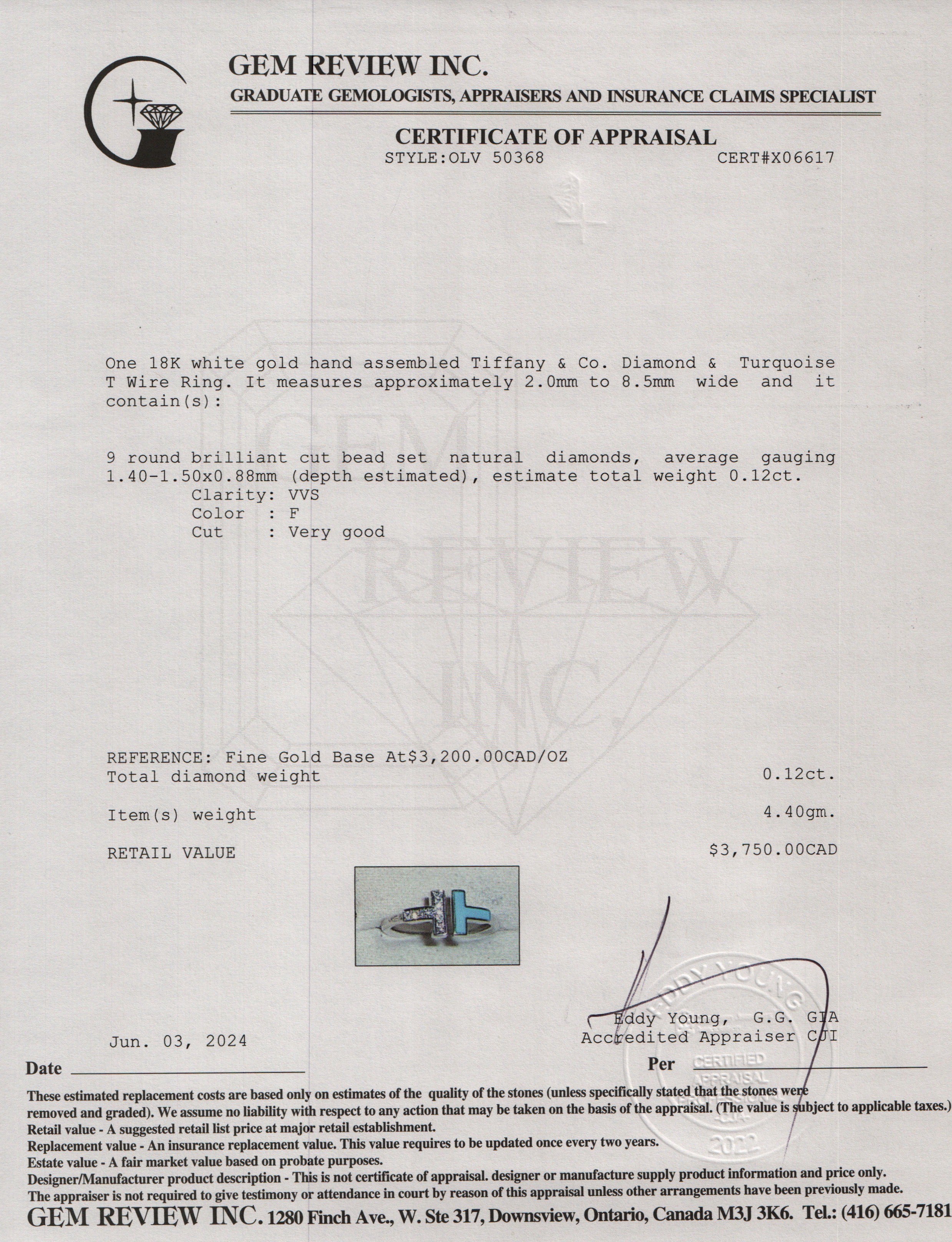 18k White Gold Diamond & Turquoise T Wire Ring, Size 7.5 w/ Box