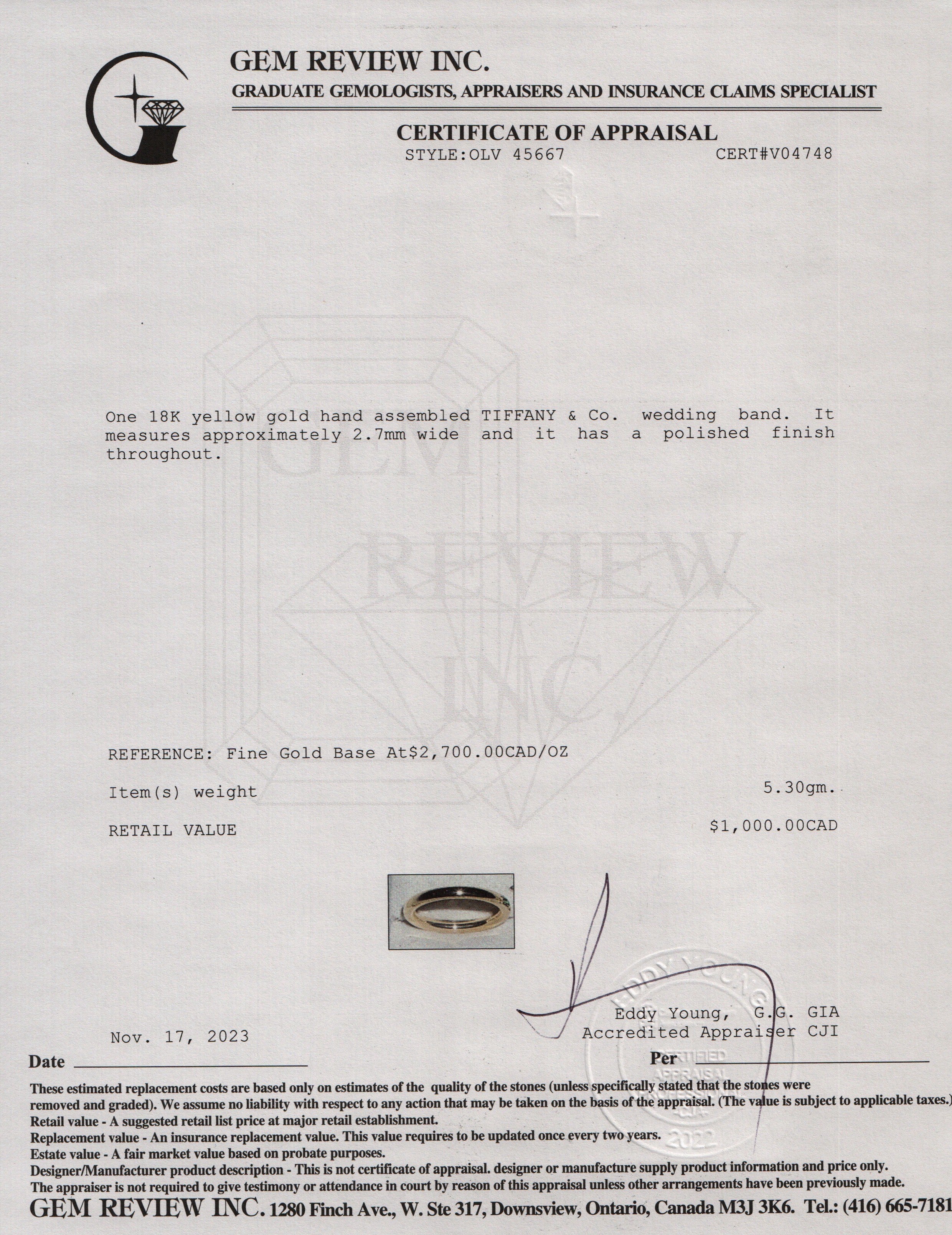 18k Yellow Gold 2.7MM Wedding Band Ring, Size 7