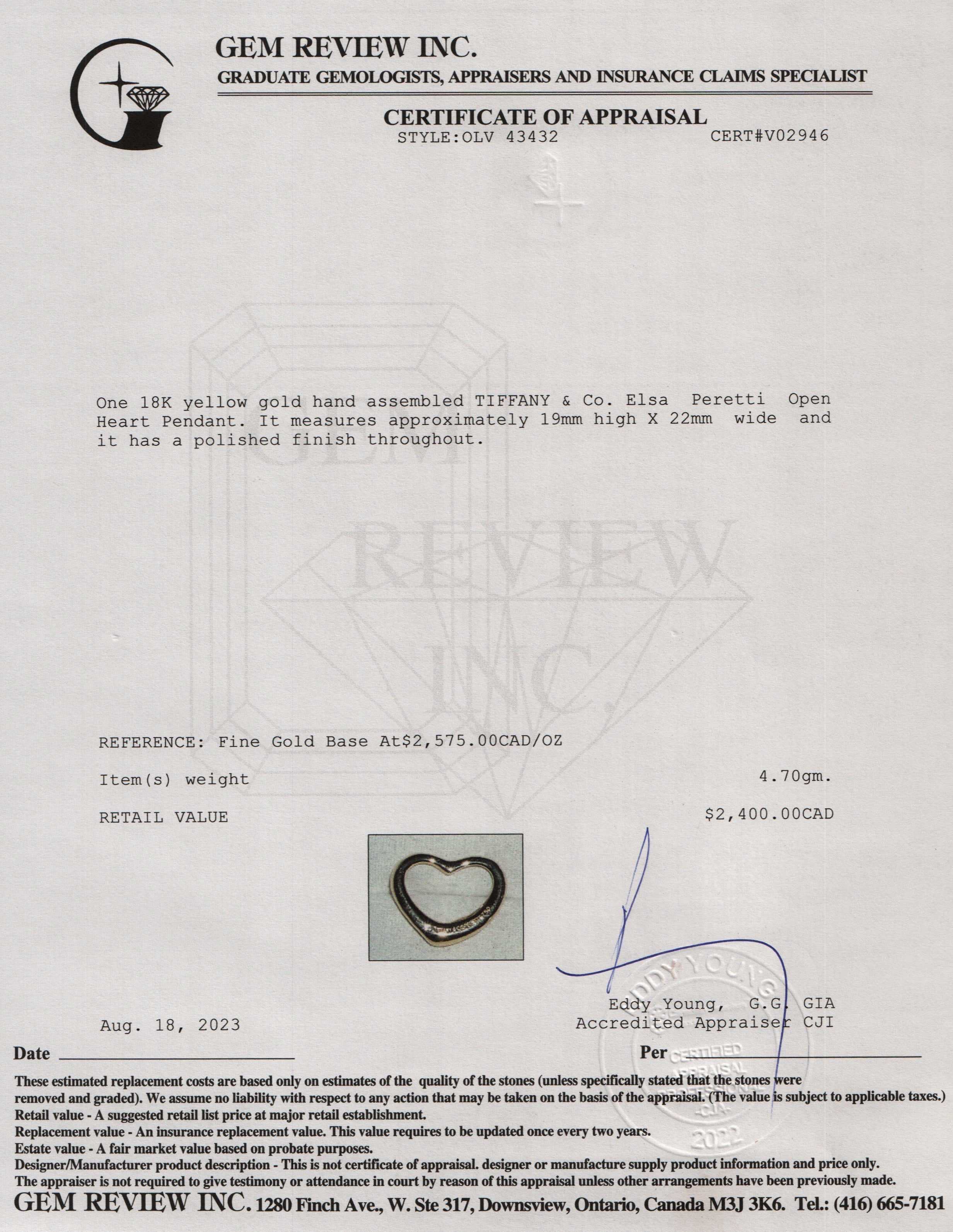 18k Yellow Gold Elsa Peretti Open Heart Pendant, 22 MM