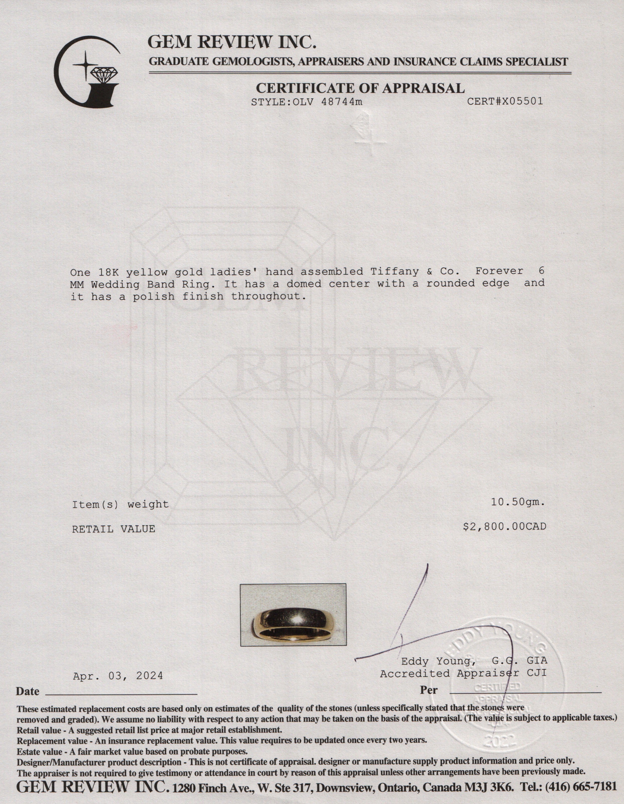 18k Yellow Gold Forever 6 MM Wedding Band Ring, Size 10.75