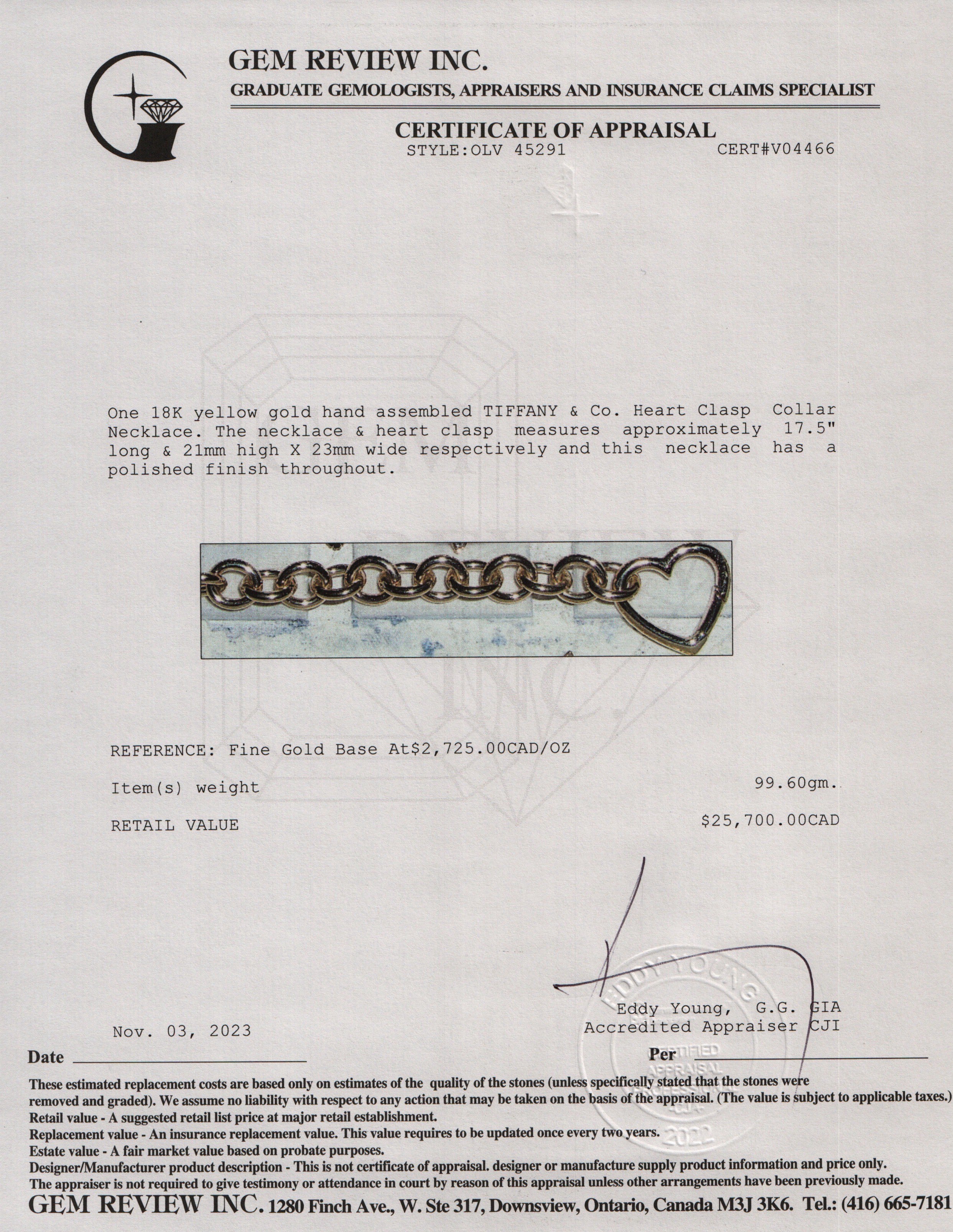 18k Yellow Gold Heart Clasp Collar Necklace w/ Box