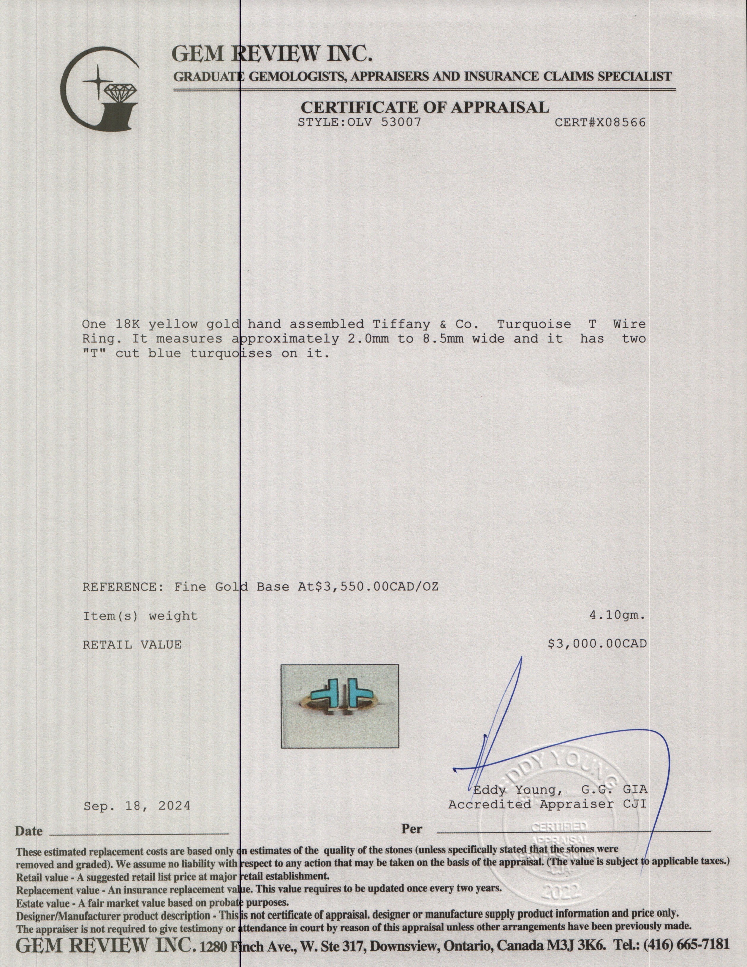 18k Yellow Gold Turquoise T Wire Ring, Size 7 w/ Box