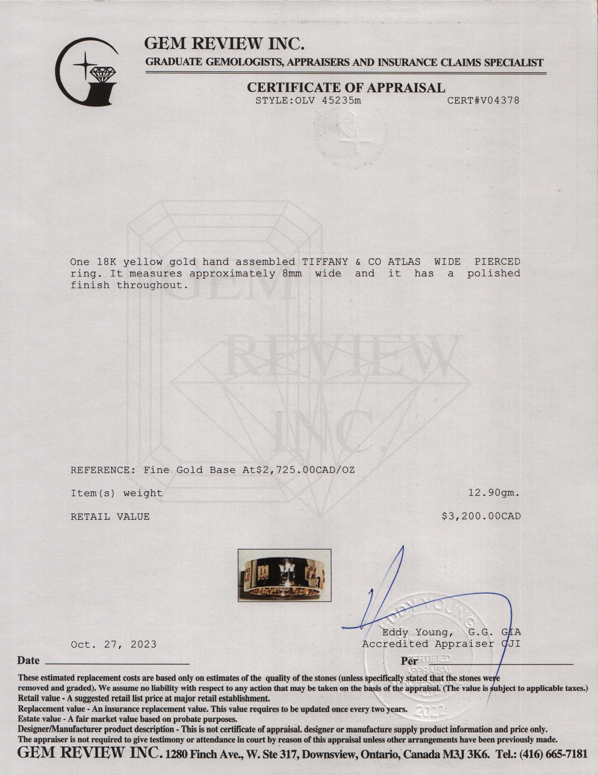 18k Yellow Gold Wide 8MM Pierced Atlas Band, Size 12