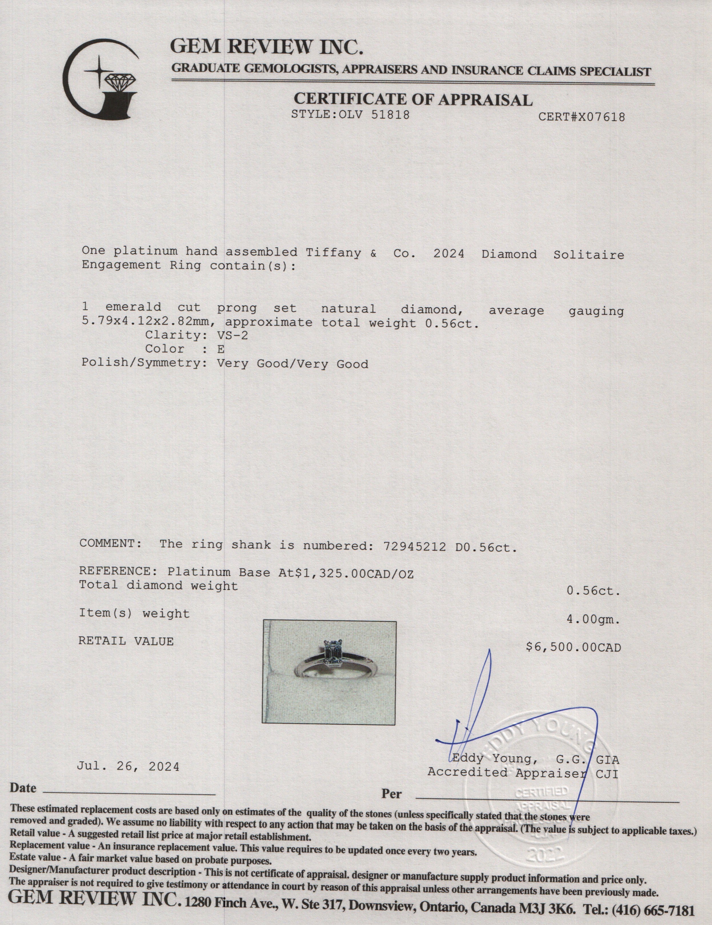 2024 Platinum Emerald Cut 0.56 ct. Diamond Solitaire Engagement Ring w/ Box & Papers