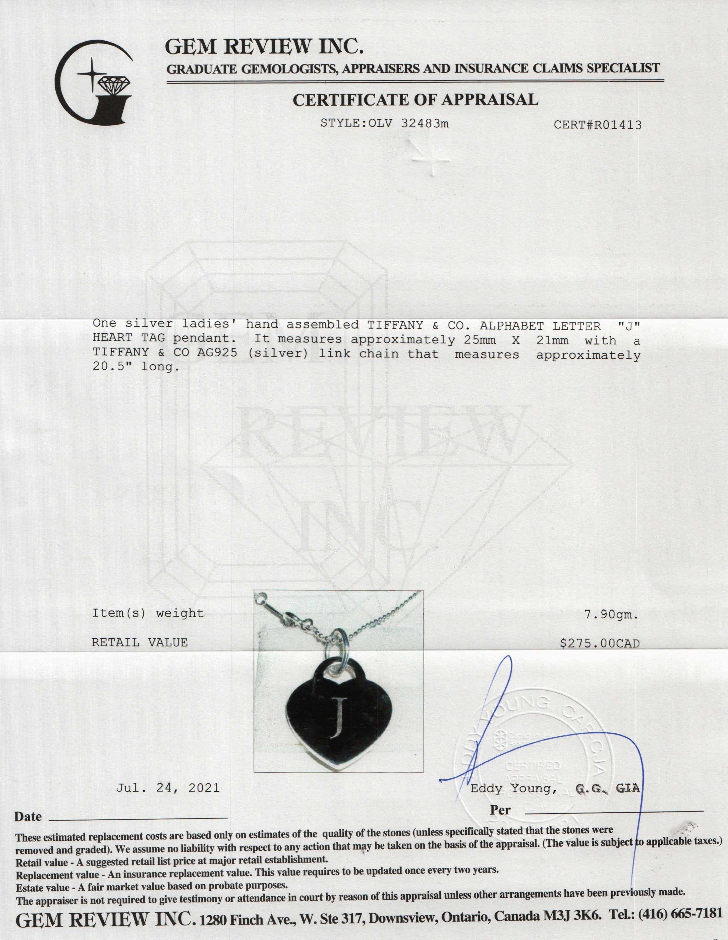 Tiffany & Co. Alphabet Letter 'J' Heart Tag Pendant Necklace