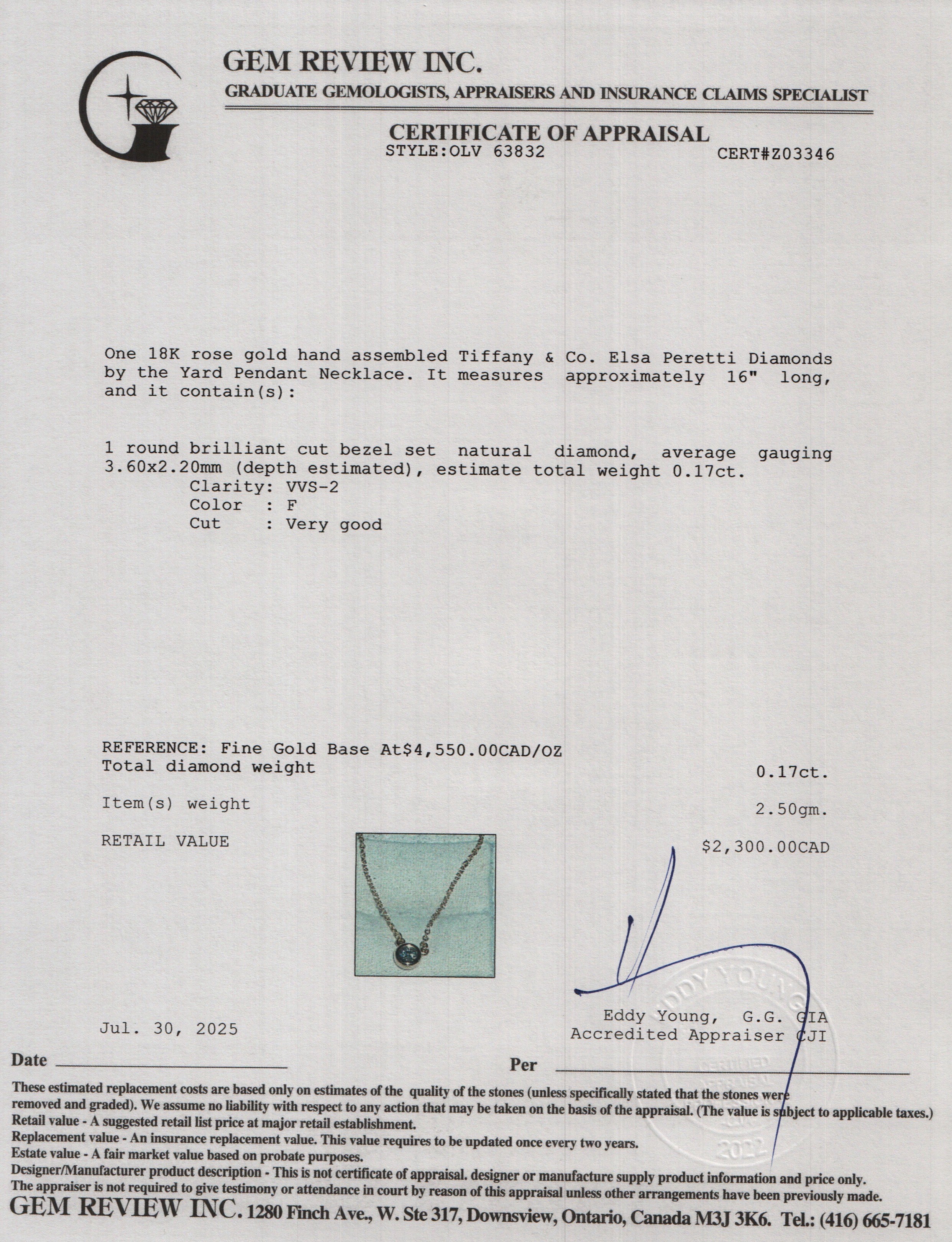 Elsa Peretti 18k Rose Gold 0.17 ct. Diamonds by the Yard Pendant Necklace w/ Box & Receipt
