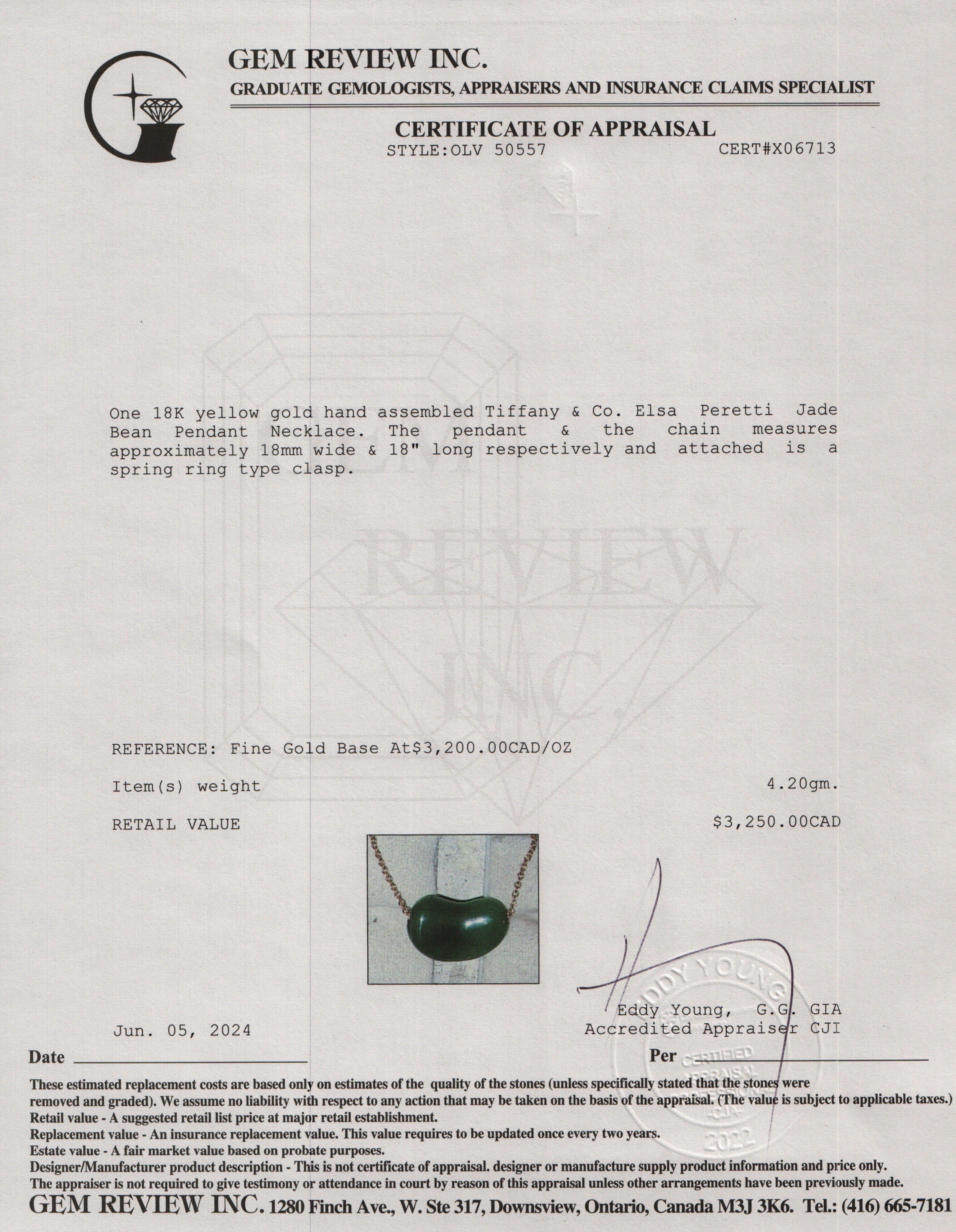Elsa Peretti 18k Yellow Gold 18 MM Jade Bean Pendant Necklace w/ Box