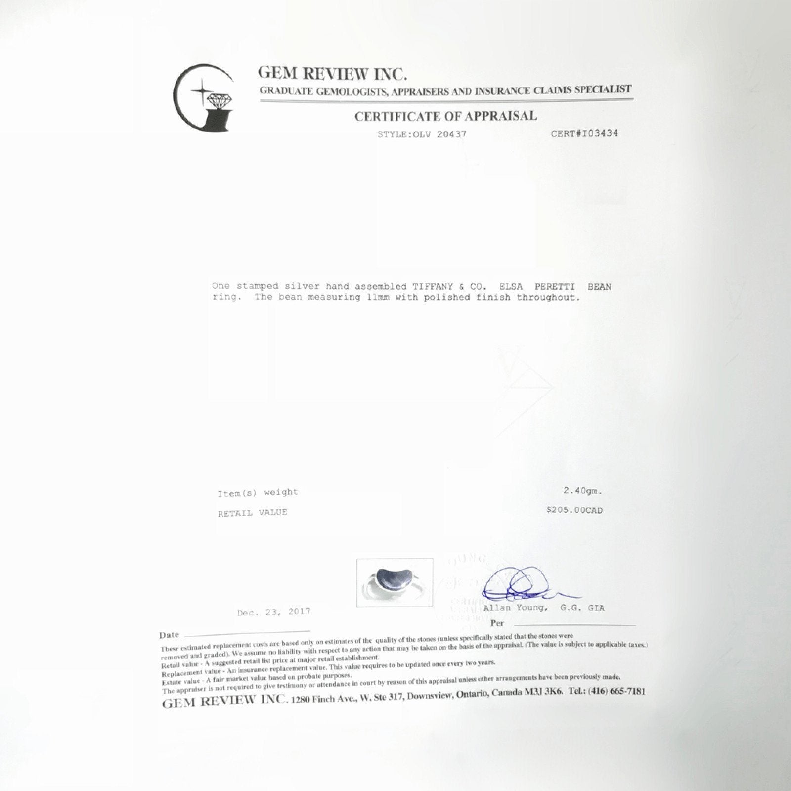 Tiffany & Co. Elsa Peretti Bean Ring in Sterling Silver; Bean, 11 mm; Comes with Gem Review Appraisal
