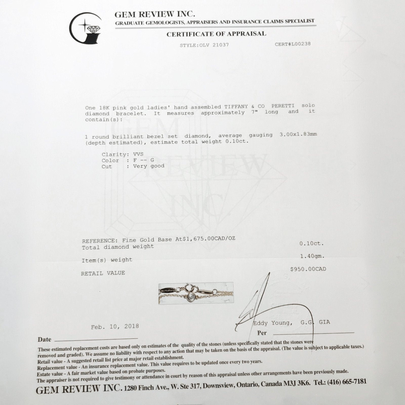 Tiffany & Co Elsa Peretti Diamonds By The Yard Pendant in 18K Rose Gold with a Round Brilliant Diamond (0.04 CT), 16” Long Necklace, Comes with Gem Review Appraisal