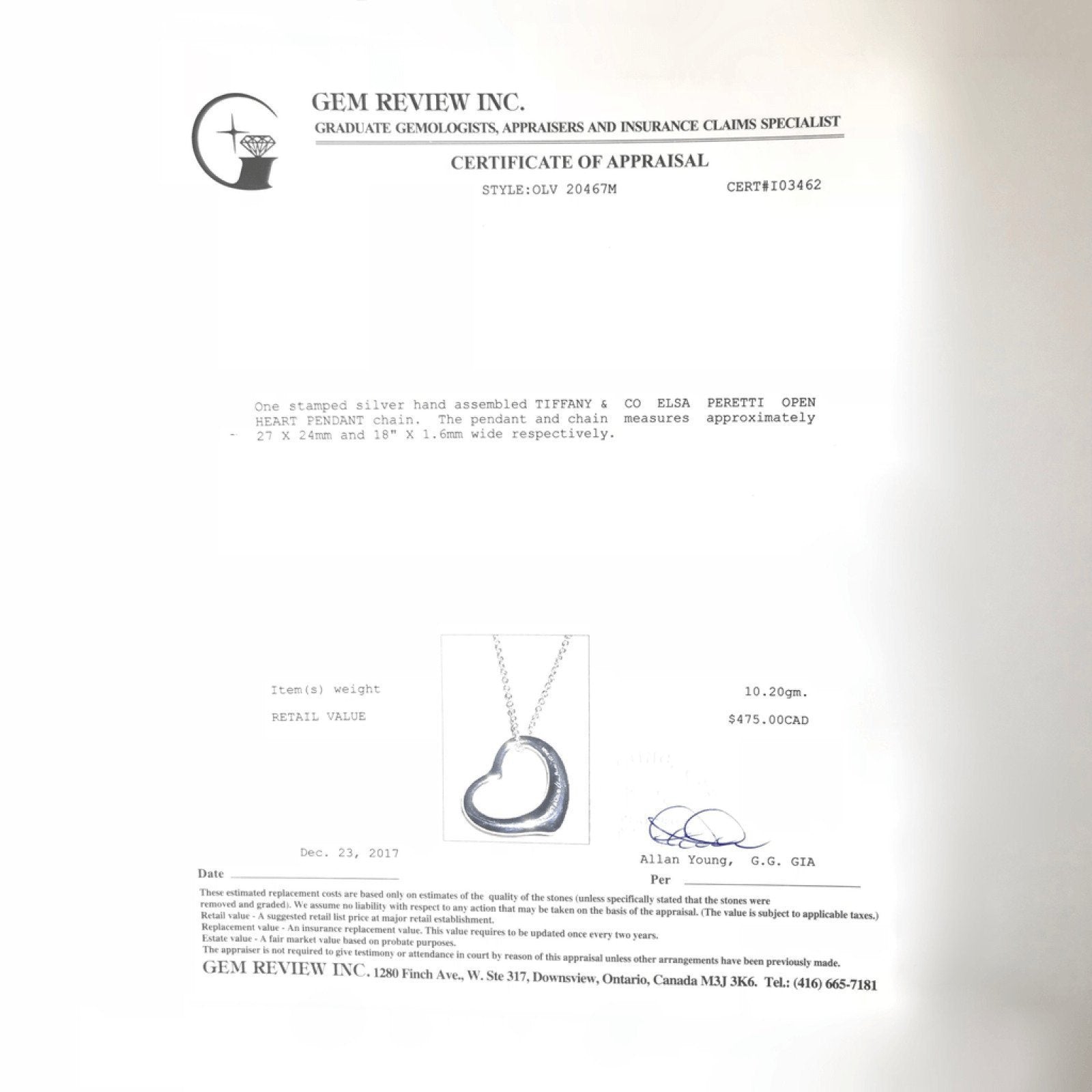 Tiffany & Co. Elsa Peretti Open Heart Pendant on a 18” Chain in Sterling Silver; Pendant, 27 mm Wide; Comes with Gem Review Appraisal