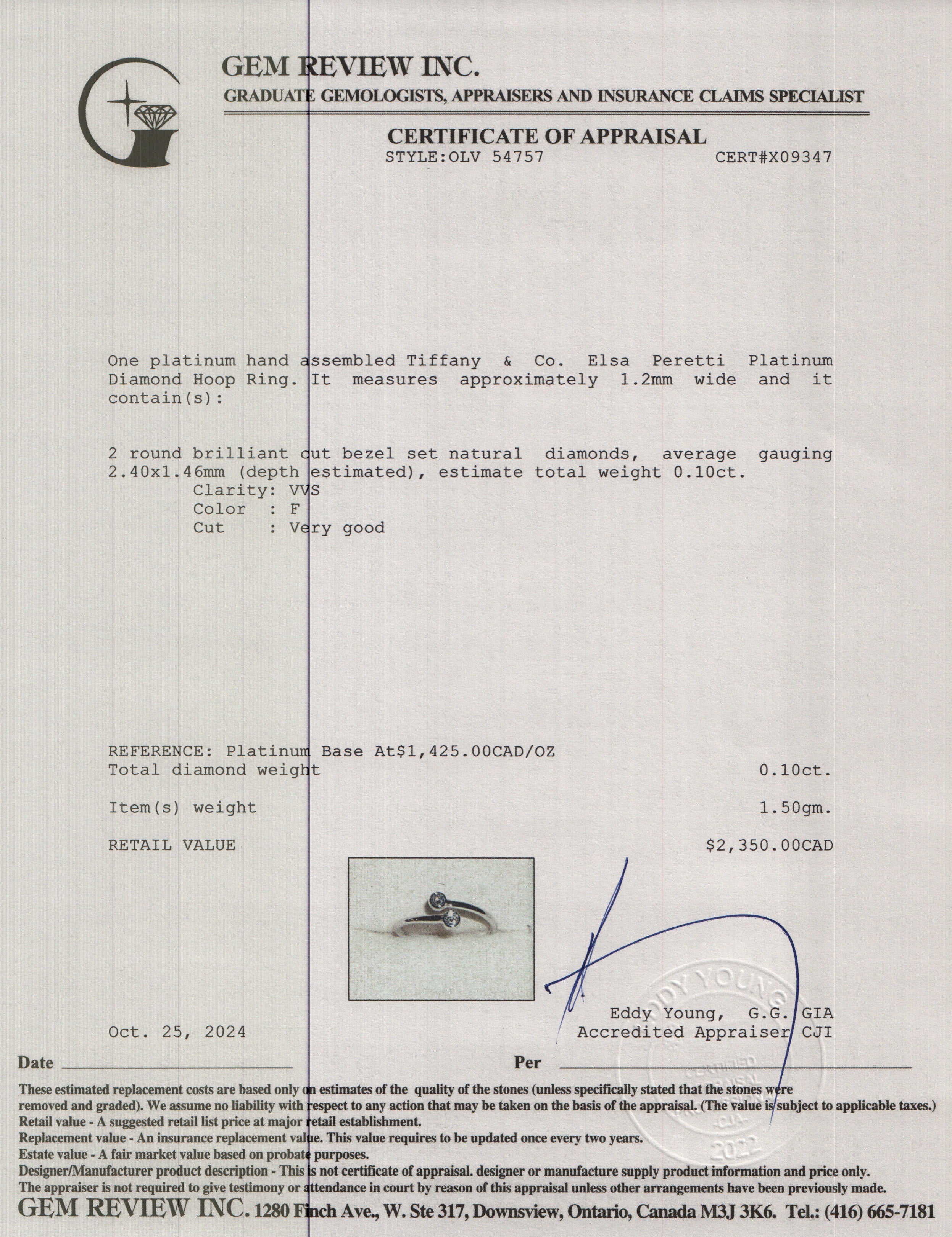 Elsa Peretti Platinum Diamond Hoop Ring, Size 4.25