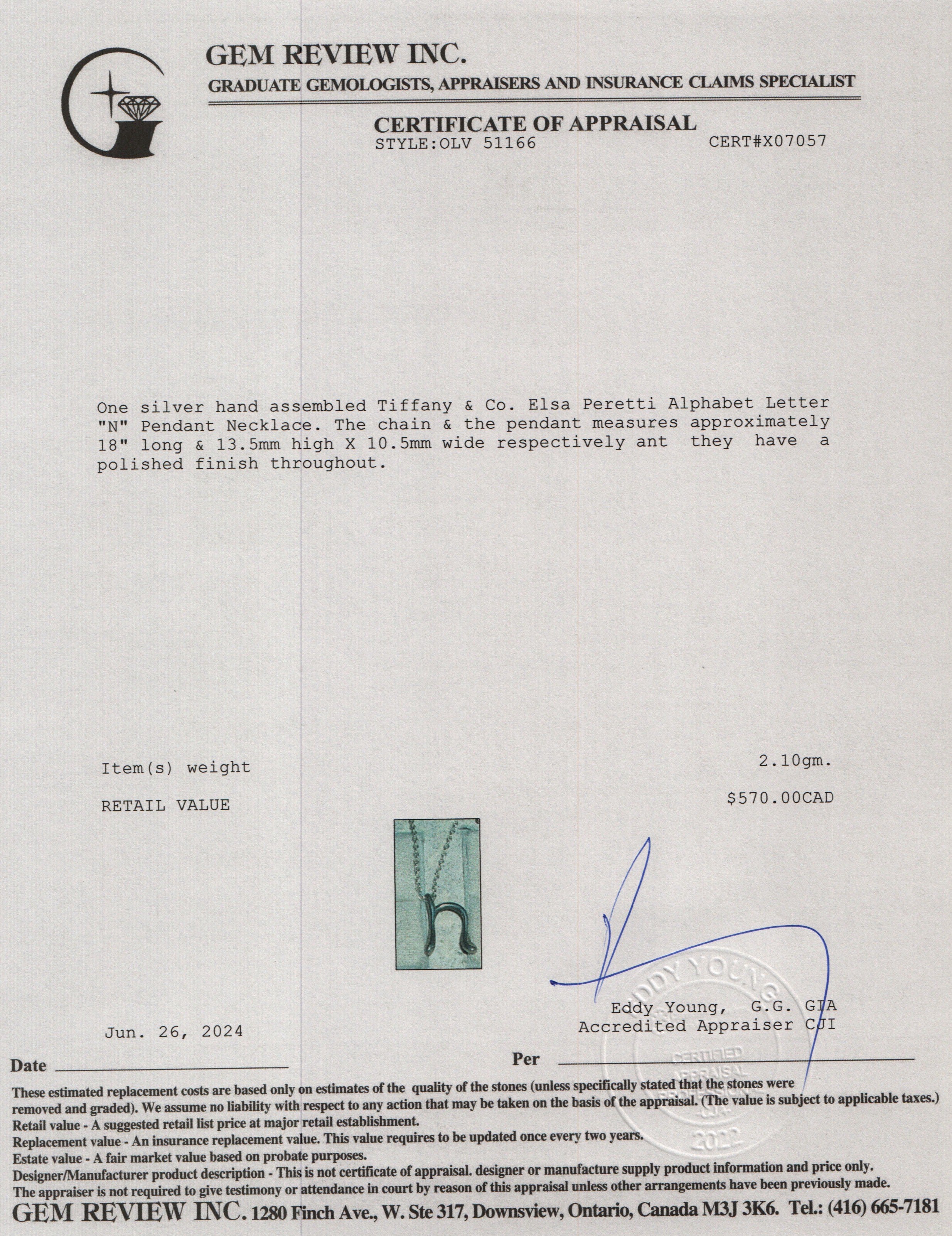 Elsa Peretti Sterling Silver Alphabet Letter "N" Pendant Necklace