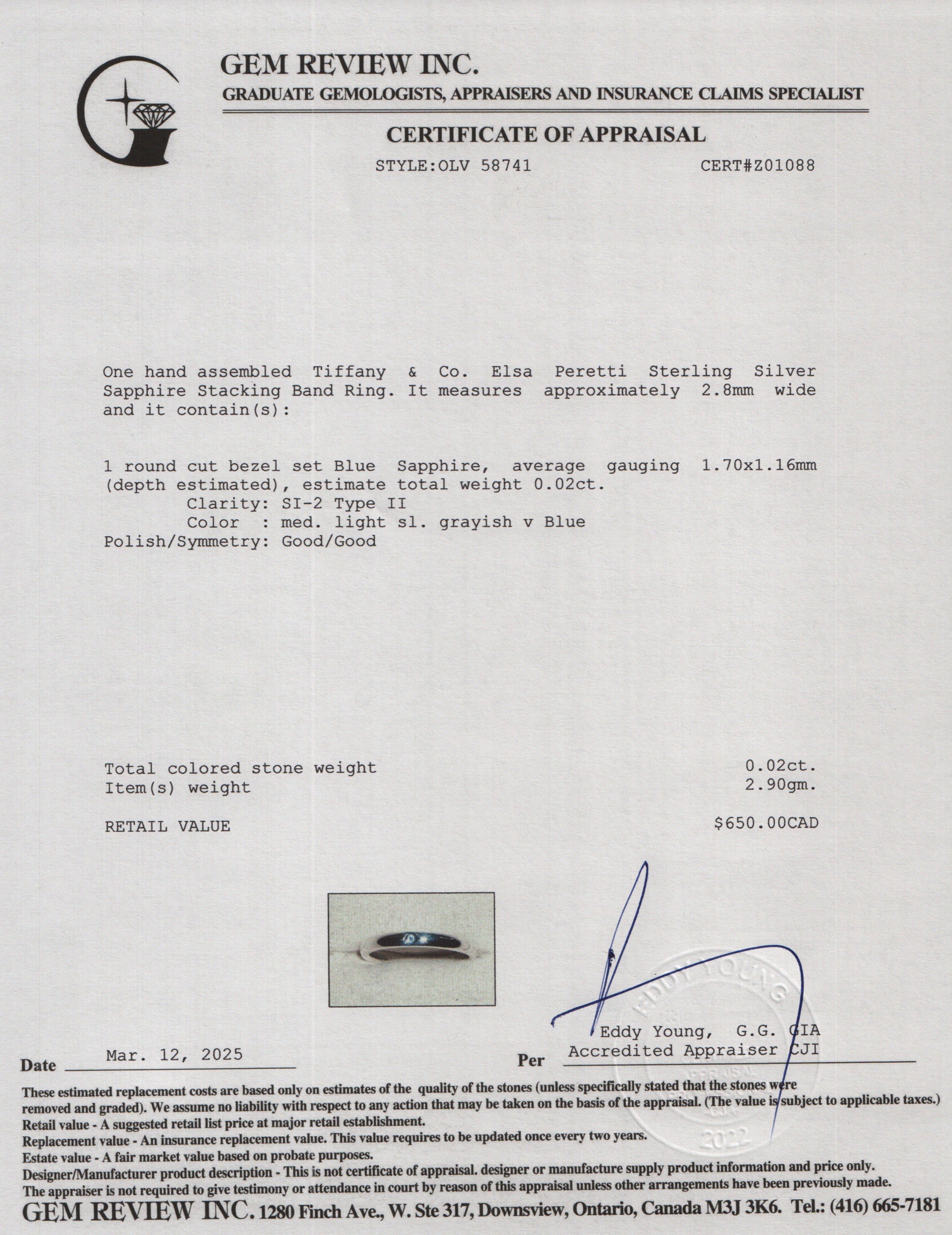 Elsa Peretti Sterling Silver Sapphire Stacking Band Ring, Size 8
