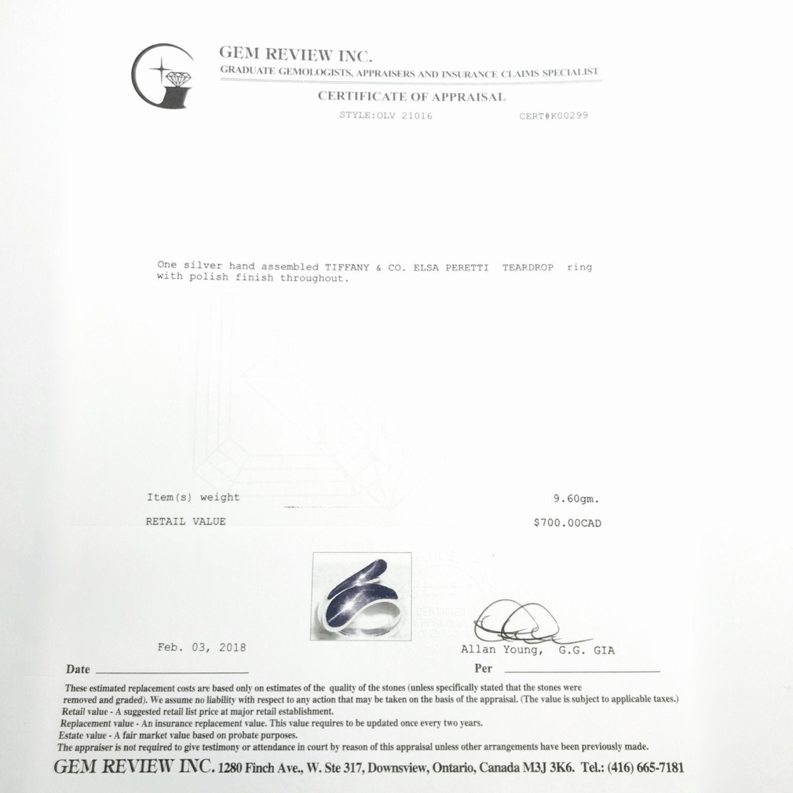 Tiffany & Co Elsa Peretti Teardrop Ring in Sterling Silver, Size 7, Comes with Gem Review Appraisal