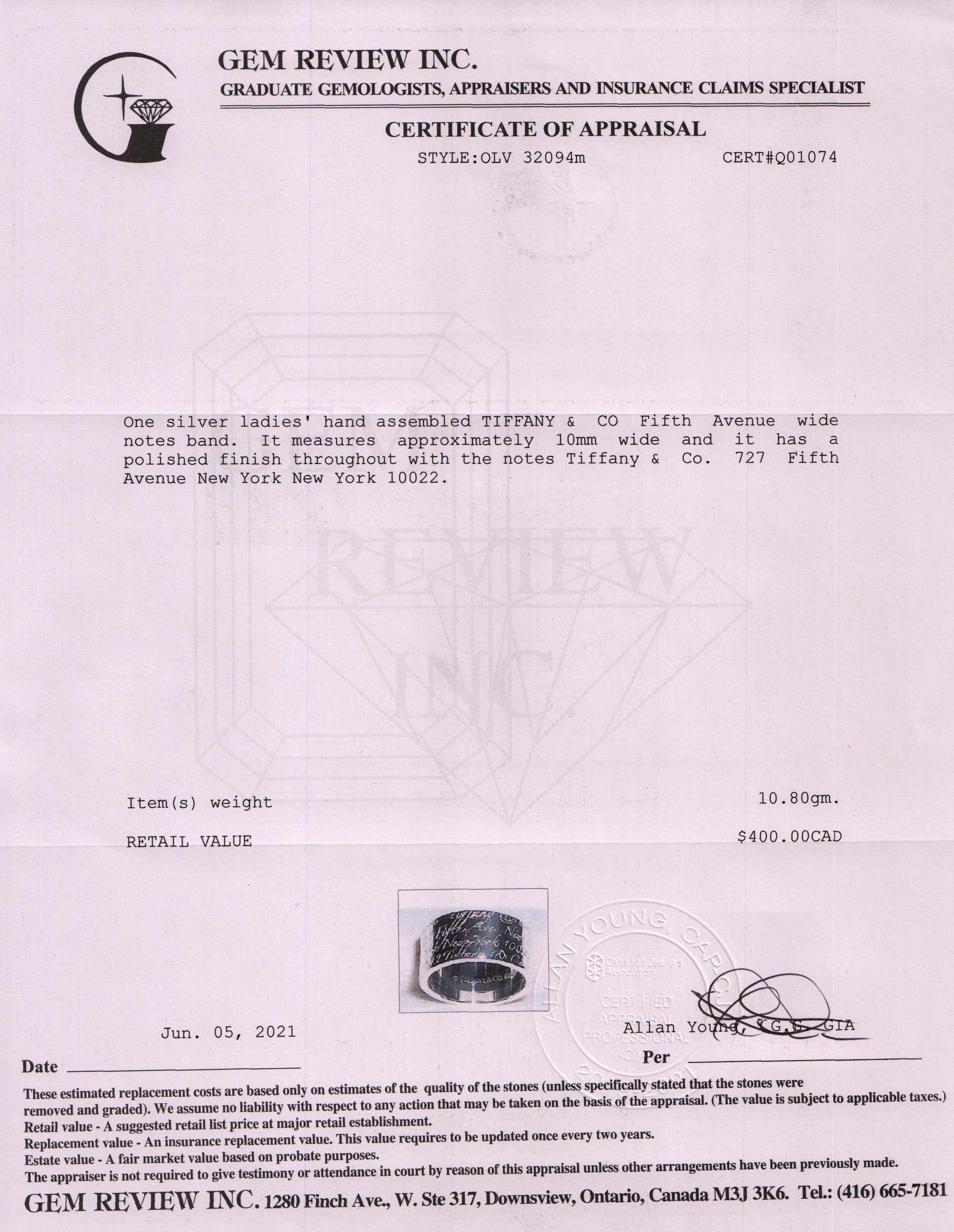 Tiffany & Co. Fifth Ave Wide Notes Band Ring