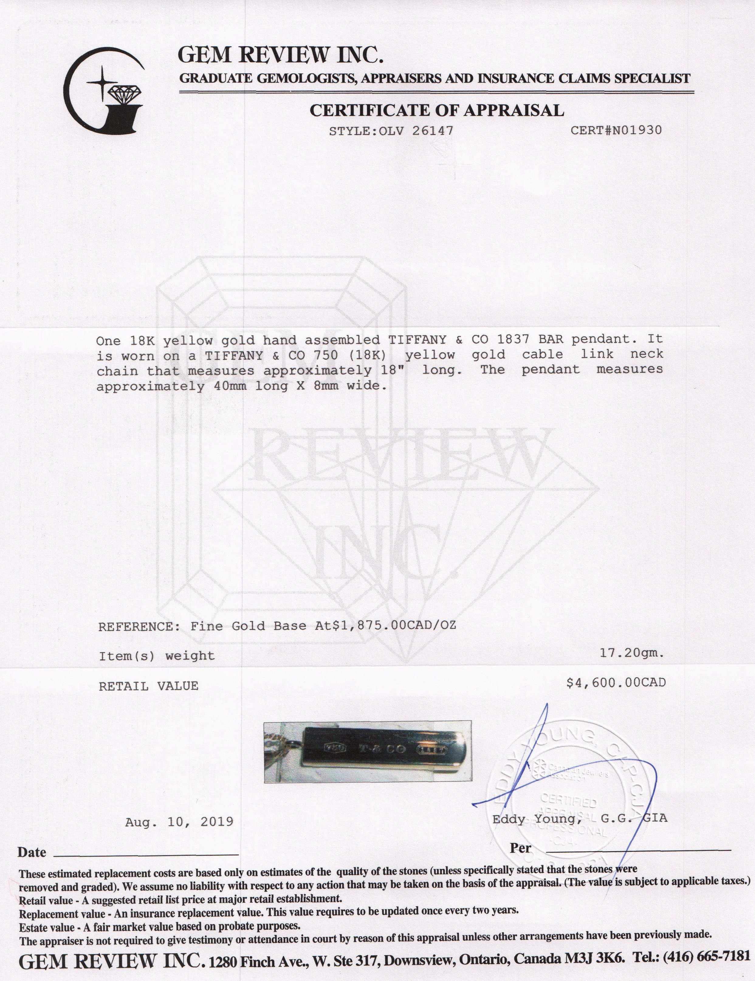 Tiffany & Co. Gold 1837 Bar Pendant Necklace