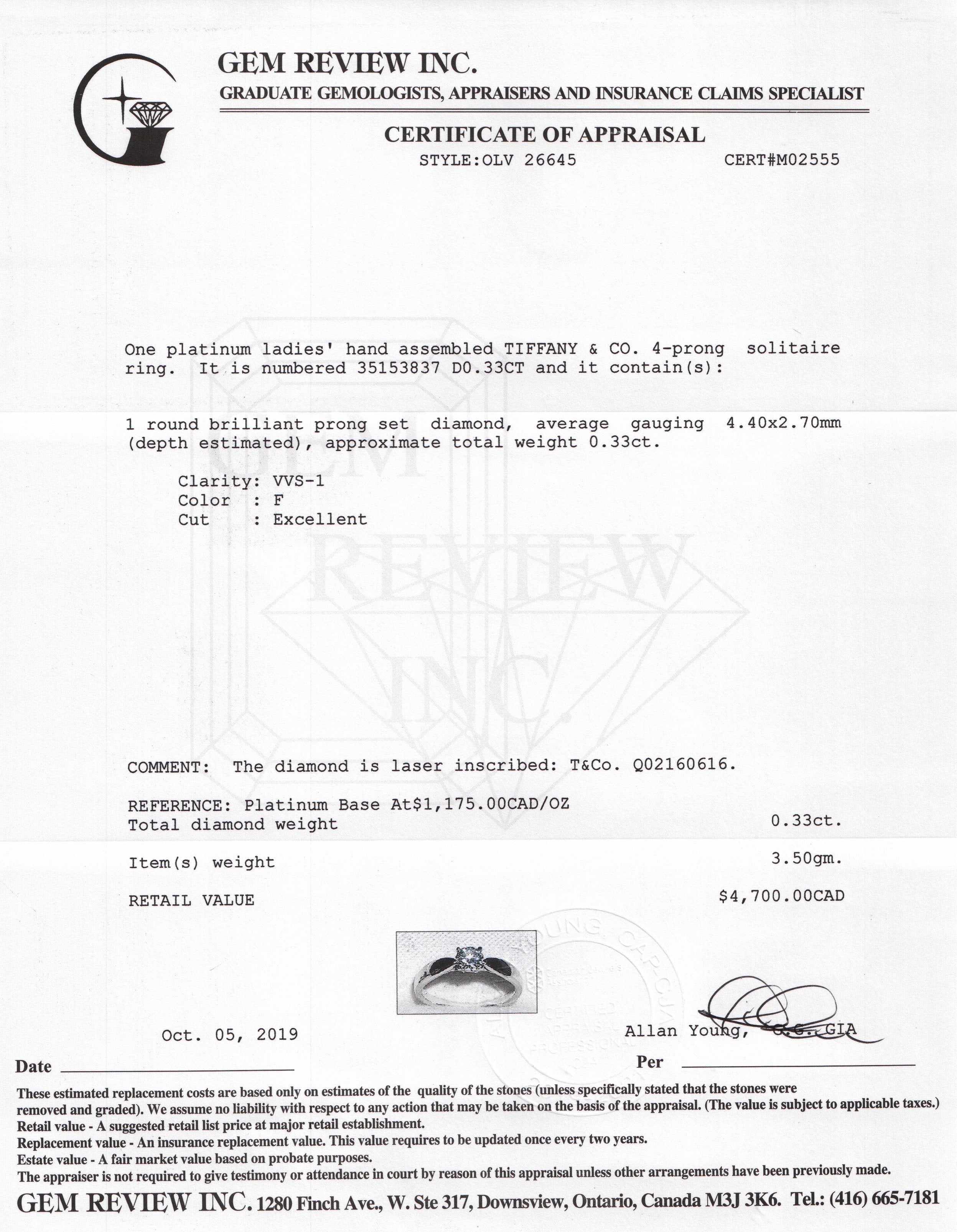 - 1 Round Brilliant Cut Diamond Weighing 0.33 ct. of VVS1 Clarity, F Colour, Excellent Cut