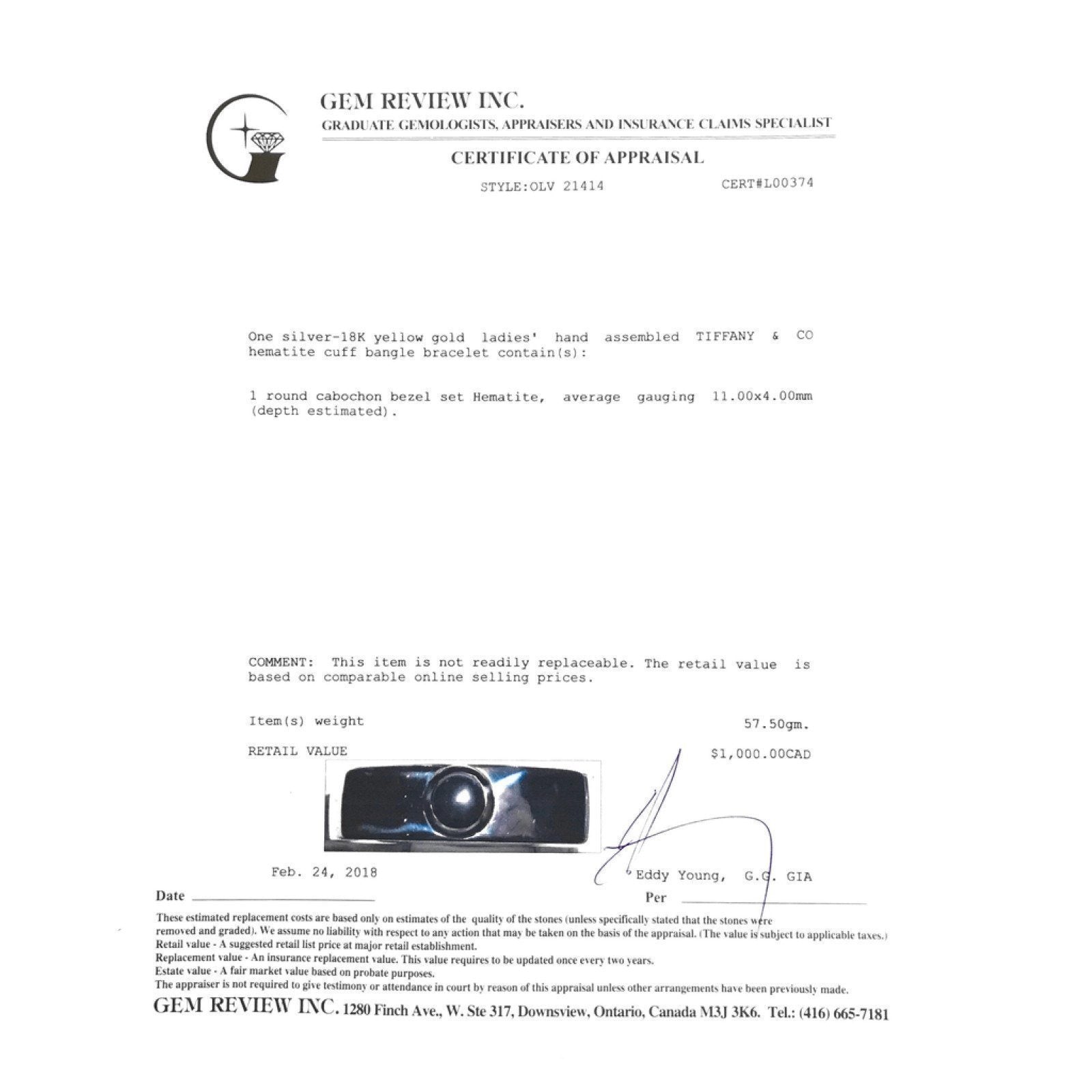 Tiffany & Co Cuff Bangle Bracelet in Sterling Silver and 18K Yellow Gold Set with 1 Round Cabochon Hematite (Approximately 11mm x 4mm), Comes with Gem Review Appraisal