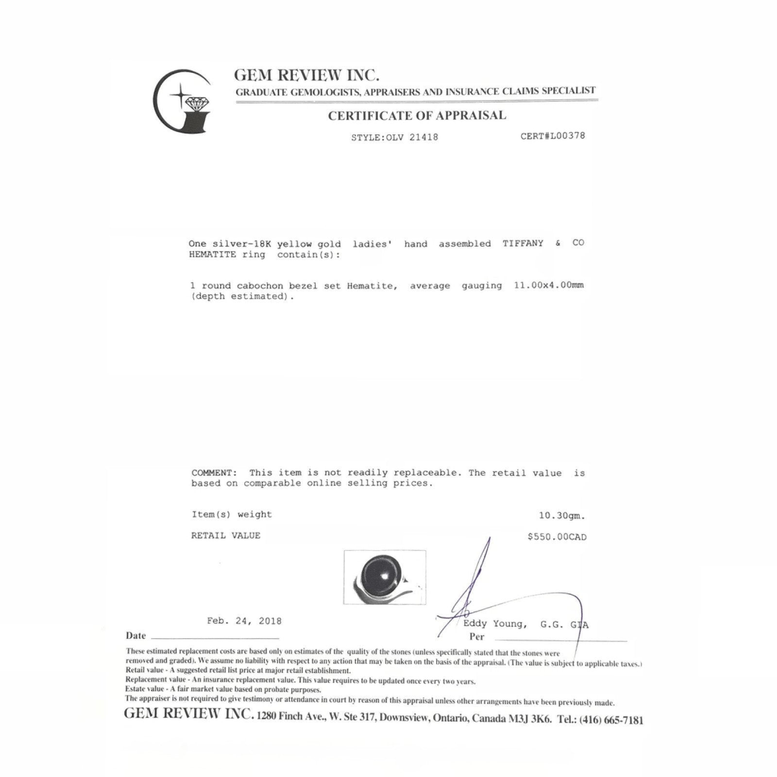 Tiffany & Co Ring in Sterling Silver and 18K Yellow Gold Set with 1 Round Cabochon Hematite (Approximately 11mm x 4mm), Ring Size: 6 3/4, Comes with Gem Review Appraisal