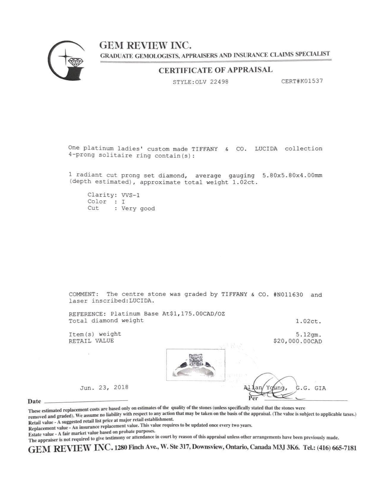 - Signature/Hallmarks: Tiffany & Co. Lucida Pt950 5970744 N011630 1.02 ct.
