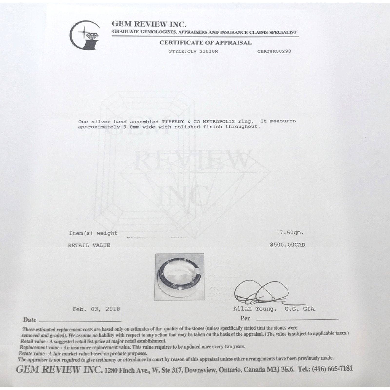 Tiffany & Co Metropolis Ring In Sterling SIlver: 9mm Wide, Size 9, Comes with Gem Review Appraisal