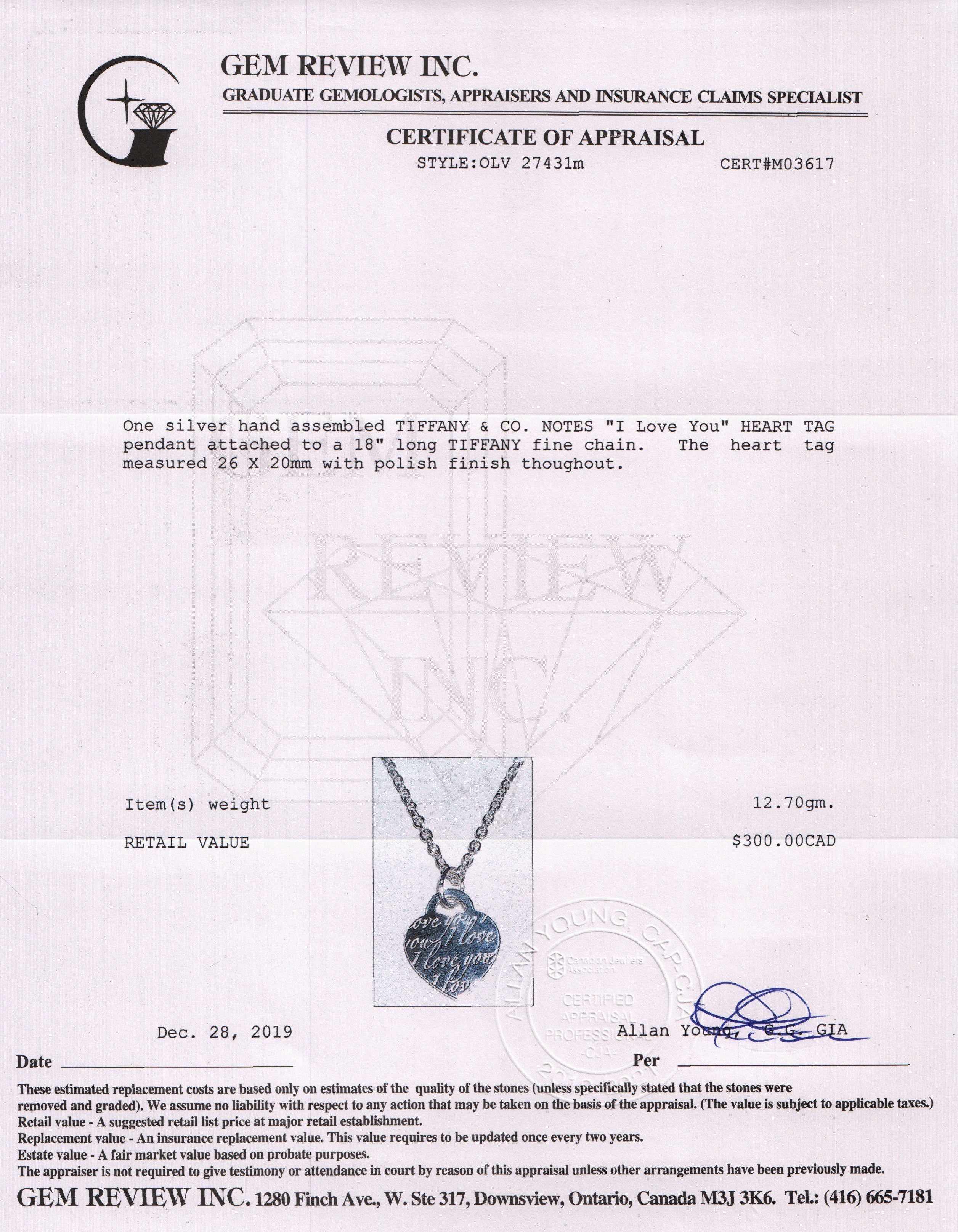 Tiffany & Co. Notes "I Love You" Heart Tag Pendant Necklace